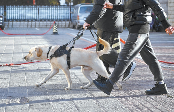 “好!保持,慢一点……”8时30分,农学院北门外,一位视障学员在导盲犬引导下缓慢前行。一位训导员跟随其后,随时发布口令。