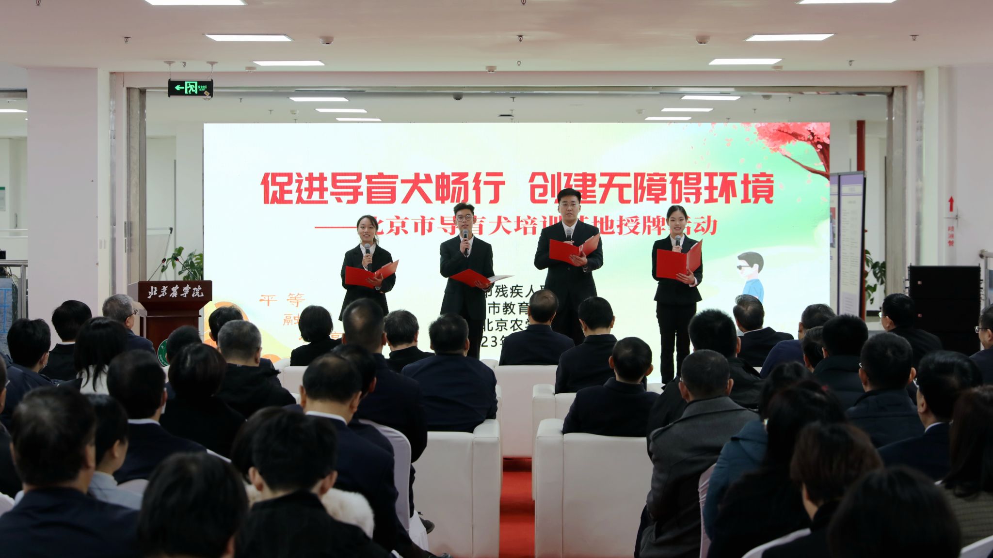 武维华、李东梅、侯君舒、刘宇辉共同为“北京市导盲犬培训基地”揭牌。
