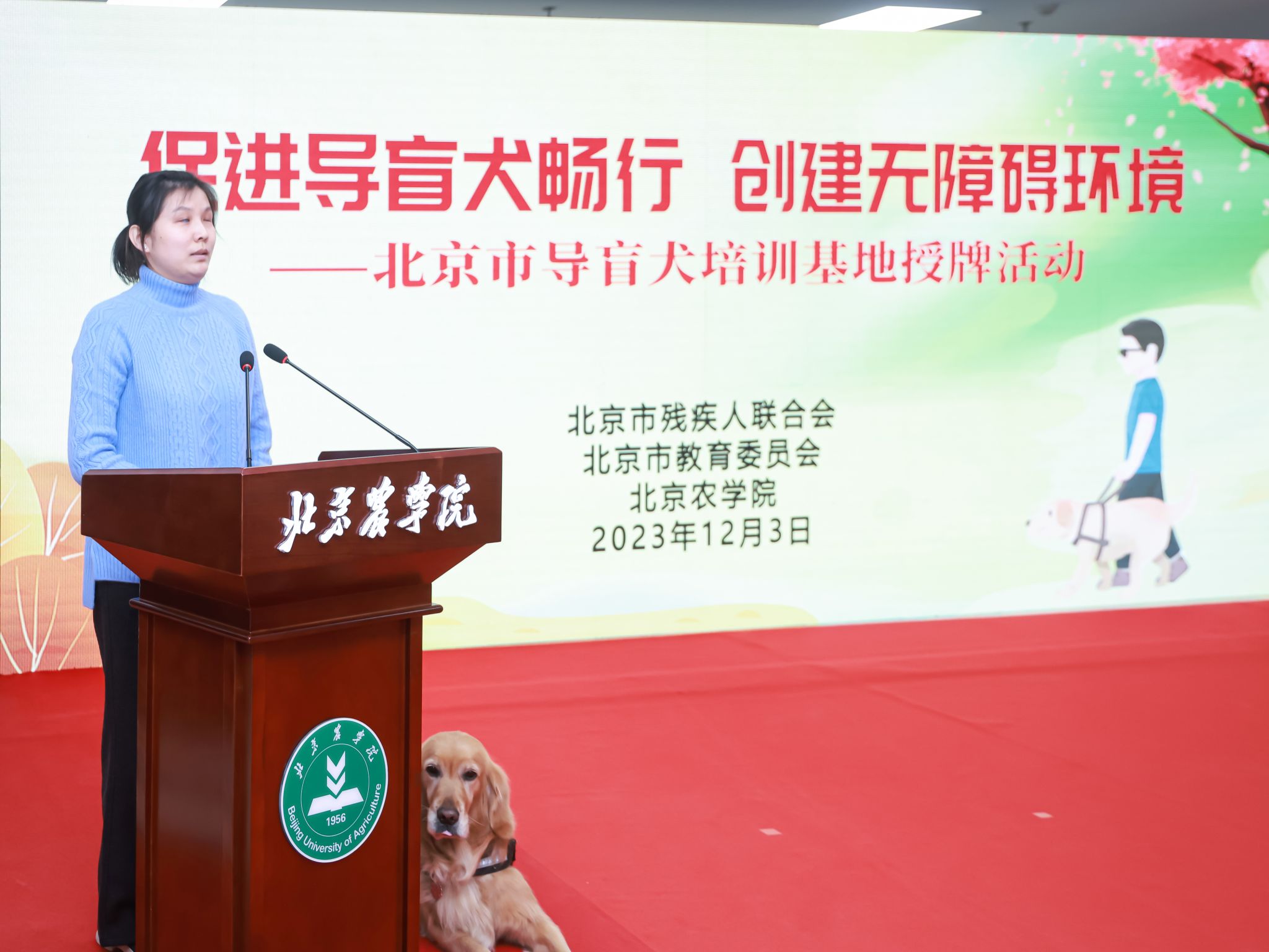 为深入贯彻习近平总书记关于残疾人事业发展的重要论述和指示批示精神,落实市委市政府决策部署,促进首都残疾人事业高质量发展,在第32个“国际残疾人日”来临之际,12月3日上午,北京市残疾人联合会、北京市教育委员会、美加墨世界杯官网联合举办以“促进导盲犬畅行、创建无障碍环境”为主题的导盲犬培训基地授牌活动,北京市首家导盲犬培训基地落户美加墨世界杯官网。全国人大常委会副委员长、九三学社中央主席、中国科学院院士武维华,中国残联副主席、副理事长李东梅,北京市人大常委会副主任侯君舒,北京市副市长刘宇辉,以及中国残联、北京市残联、北京市教委、北京市财政局、北京市交通委、昌平区、中国农业大学、美加墨世界杯官网等单位相关领导、部门负责人以及北京市盲人代表和学校师生代表参加活动。活动由北京市残联党组书记、理事长陆晓光主持。