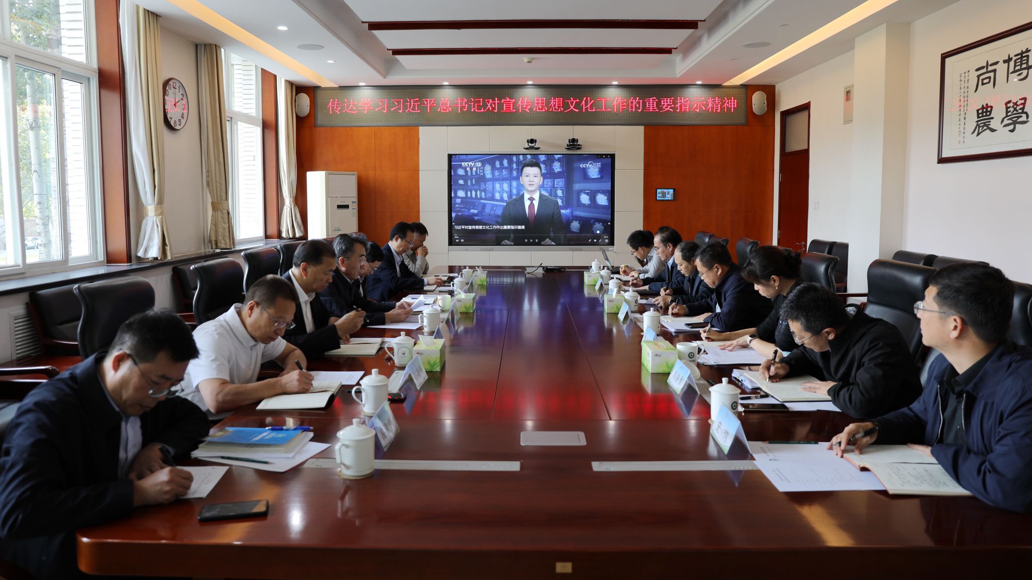 会议强调,要深入学习贯彻习近平总书记重要指示精神和全国宣传思想文化工作会议精神,充分认识新形势下做好学校宣传思想文化工作的极端重要性和紧迫性,增强做好宣传思想文化的责任感和能力本领,推动学校宣传思想文化工作不断强起来,为推动学校事业高质量发展营造风清气正、担当作为、干事创业的良好氛围和环境。要深刻领会和把握习近平文化思想的核心要义、丰富内涵和实践要求,自觉把这一重要思想贯彻落实到立德树人实际工作中,推动文化和育人深度融合,充分发挥文化建设在培养高素质人才、凝聚高质量发展合力中的重要作用,把学校丰富、独特的文化资源转化为育人实效,为首都“文化中心”建设贡献北农力量。要加强对习近平文化思想的学习、研究和阐释,及时融入思政课教学,教育引导广大北农青年增强文化自信。要牢牢把握意识形态工作的领导权和主导权,把党管宣传、党管意识形态落实到学校宣传思想文化工作全过程和各方面,广泛深入开展社会主义核心价值观教育,抓实抓细师生思想政治工作,旗帜鲜明地树正气树榜样树典型,为贯彻落实第四次党代会确定的目标任务、建设国内一流国际知名都市农林特色高水平应用型大学营造良好舆论氛围和文化环境,提供坚强思想保证和强大精神力量。