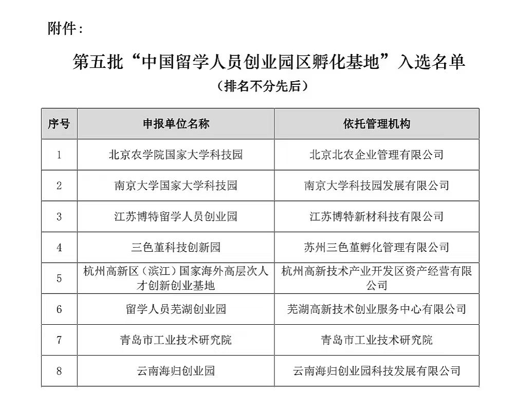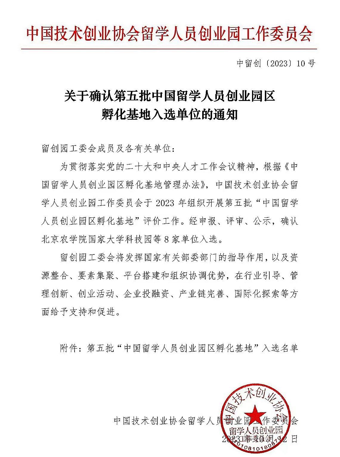 10月12日,中国技术创业协会留学人员创业园工作委员会发布《关于确认第五批中国留学人员创业园区孵化基地入选单位的通知》(中留创〔2023〕10号),美加墨世界杯官网国家大学科技园入选第五批“中国留学人员创业园区孵化基地”。