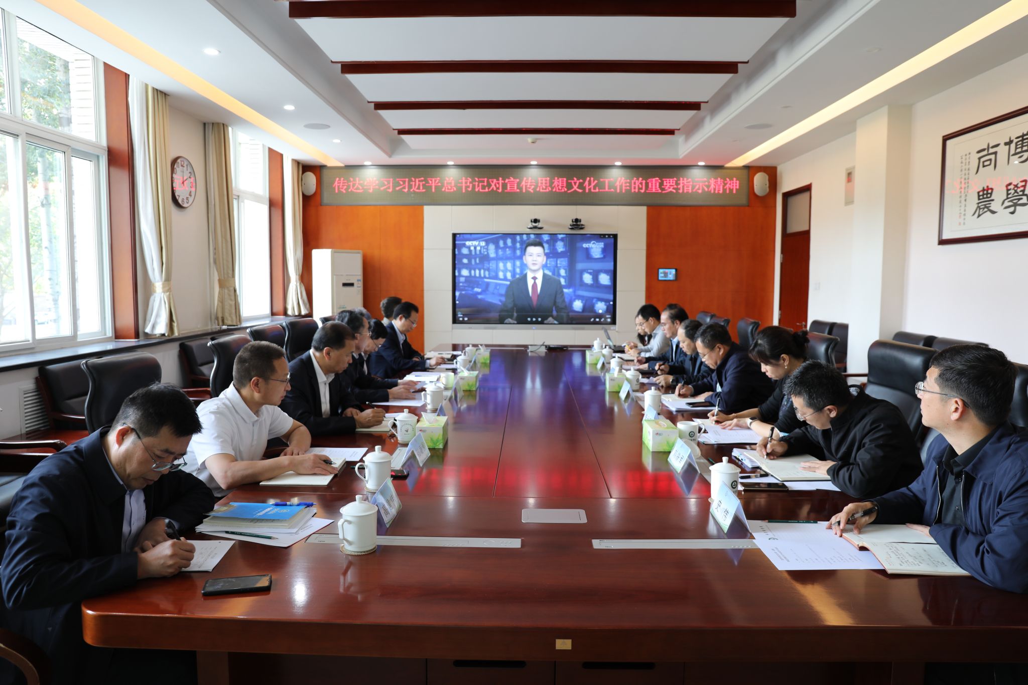 10月11日下午,学校党委召开常委会暨党委理论中心组学习会,传达学习习近平总书记重要指示精神和全国宣传思想文化工作会议精神,要求深刻领会和把握习近平文化思想的核心要义和实践要求,充分认识新形势下做好学校宣传思想文化工作的极端重要性,增强做好宣传思想文化工作的紧迫性和能力本领,为推动学校事业高质量发展营造风清气正、担当作为、干事创业的良好氛围和环境。
