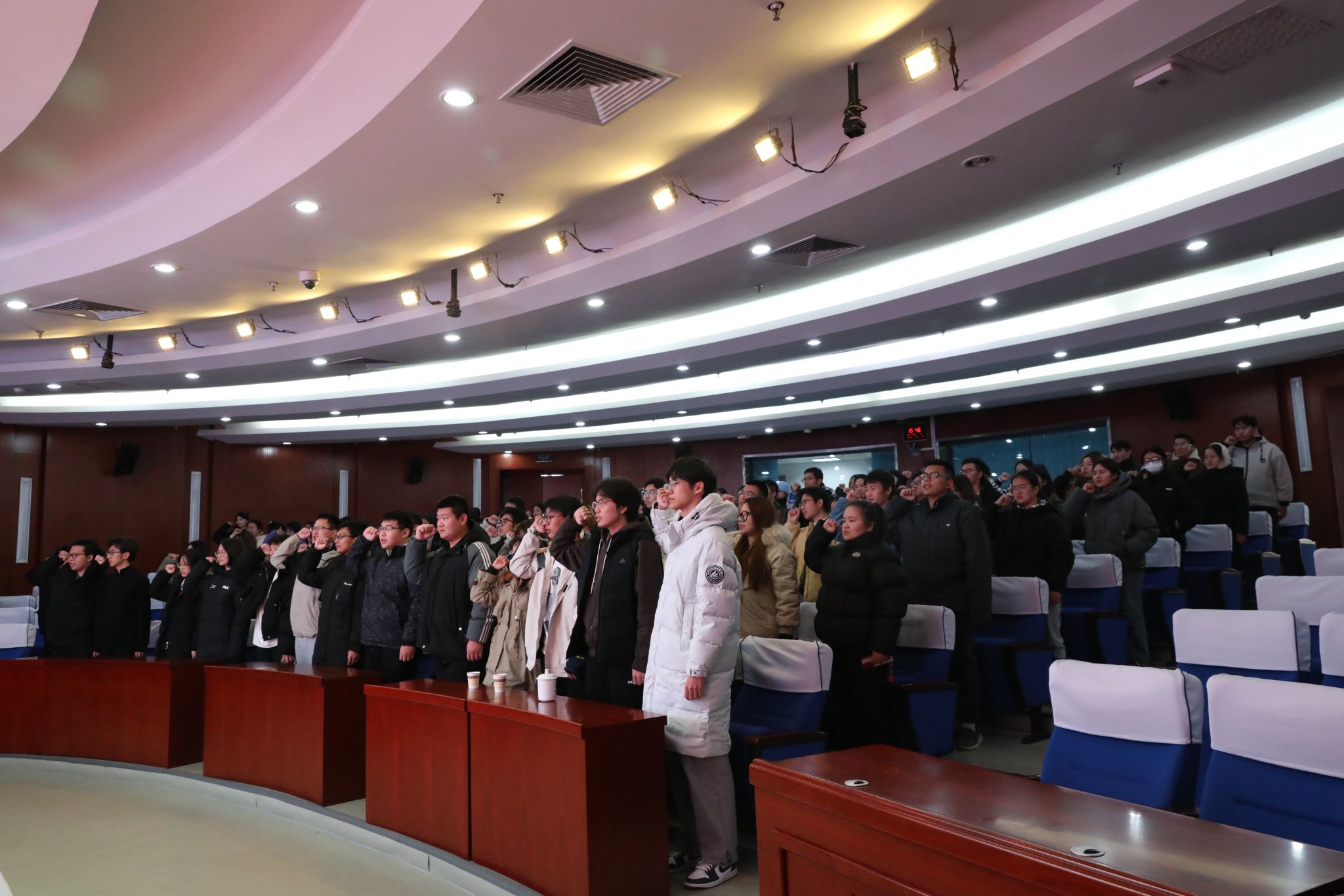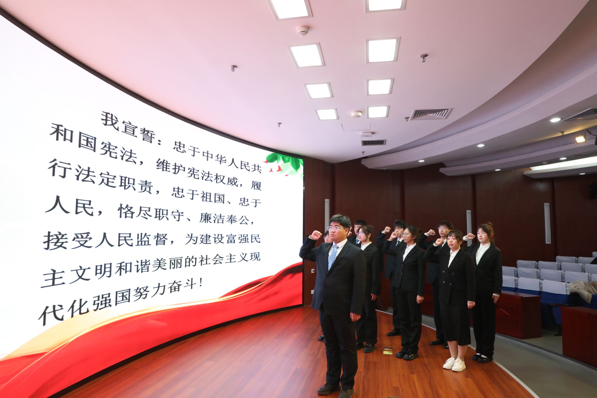 讲座结束后,文法与城乡发展学院普法宣讲团成员带领全体法学专业学生举行了宪法宣誓活动。同学们右手高举、誓言铿锵,表达为弘扬宪法精神、建设社会主义法治文化贡献力量的信心和决心。
