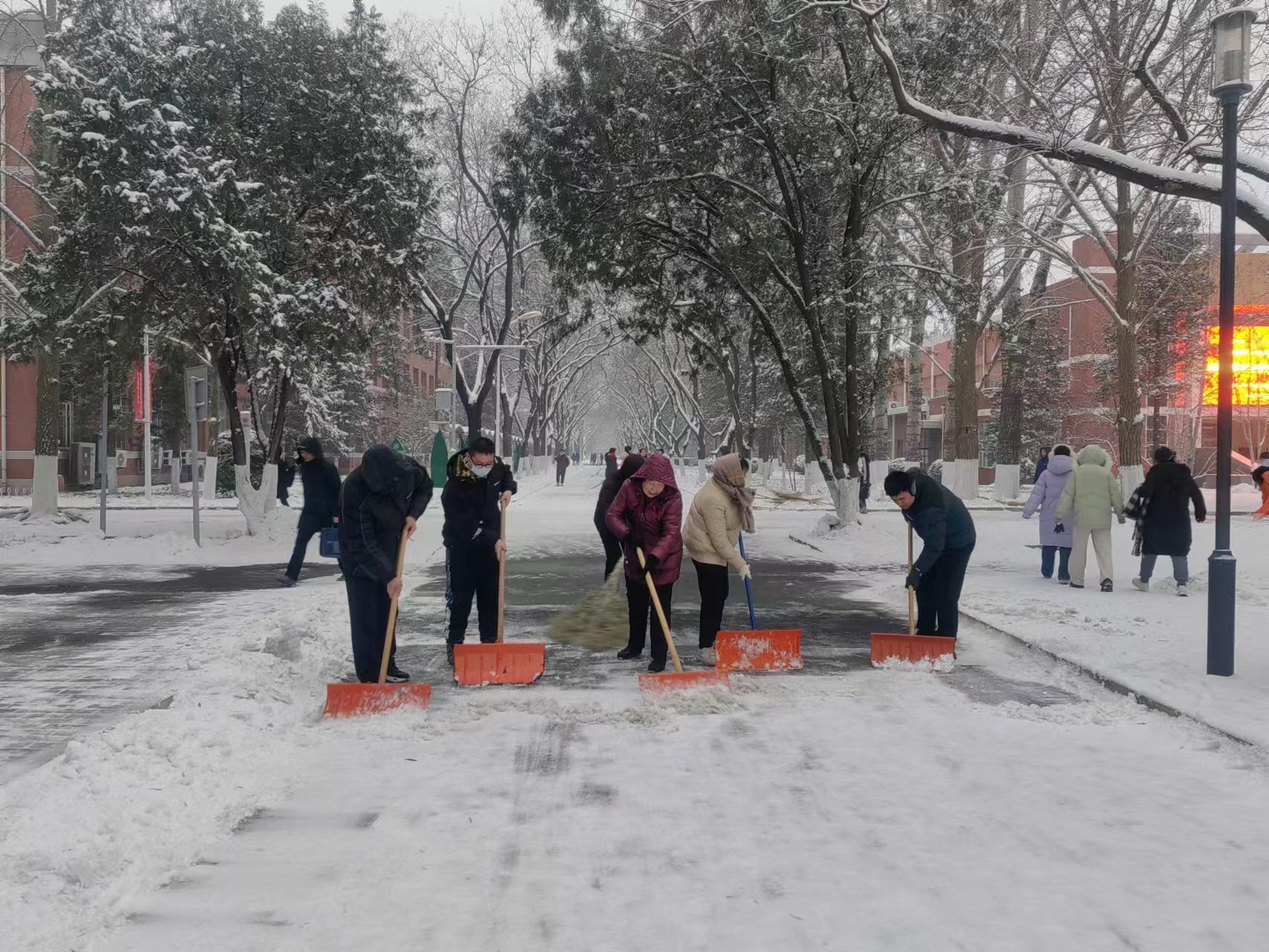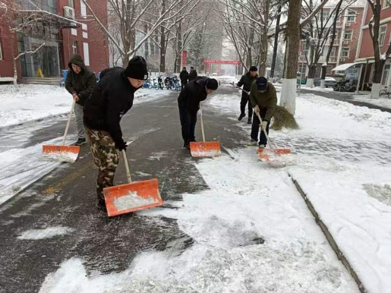 为了保障学校的正常运转和师生的出行安全,学校相关职能部门快速响应、上下联动,采取一系列应急保障措施全力应对强降雪天气。后勤基建处制定应对降雪应急预案,划分积雪清扫责任分区,组织人员进行安全排查。专门组织40名后勤党员职工组成“党员突击队”,对校园部分主干道进行清扫。与学生工作部、组织部、安全稳定工作部、机关党委等各单位联动,组织40余名退役大学生士兵、参军预备队学生开展校园积雪清扫;招募50余名教职工志愿者及保安人员组成机动力量随时待命。学校还全力做好供暖、供电、饮食等应急保障,后勤司炉人员24小时值班值守,食堂储备食材充足,公寓中心不间断随机抽测学生宿舍室内温度,确保室内采暖达标,确保师生安全。