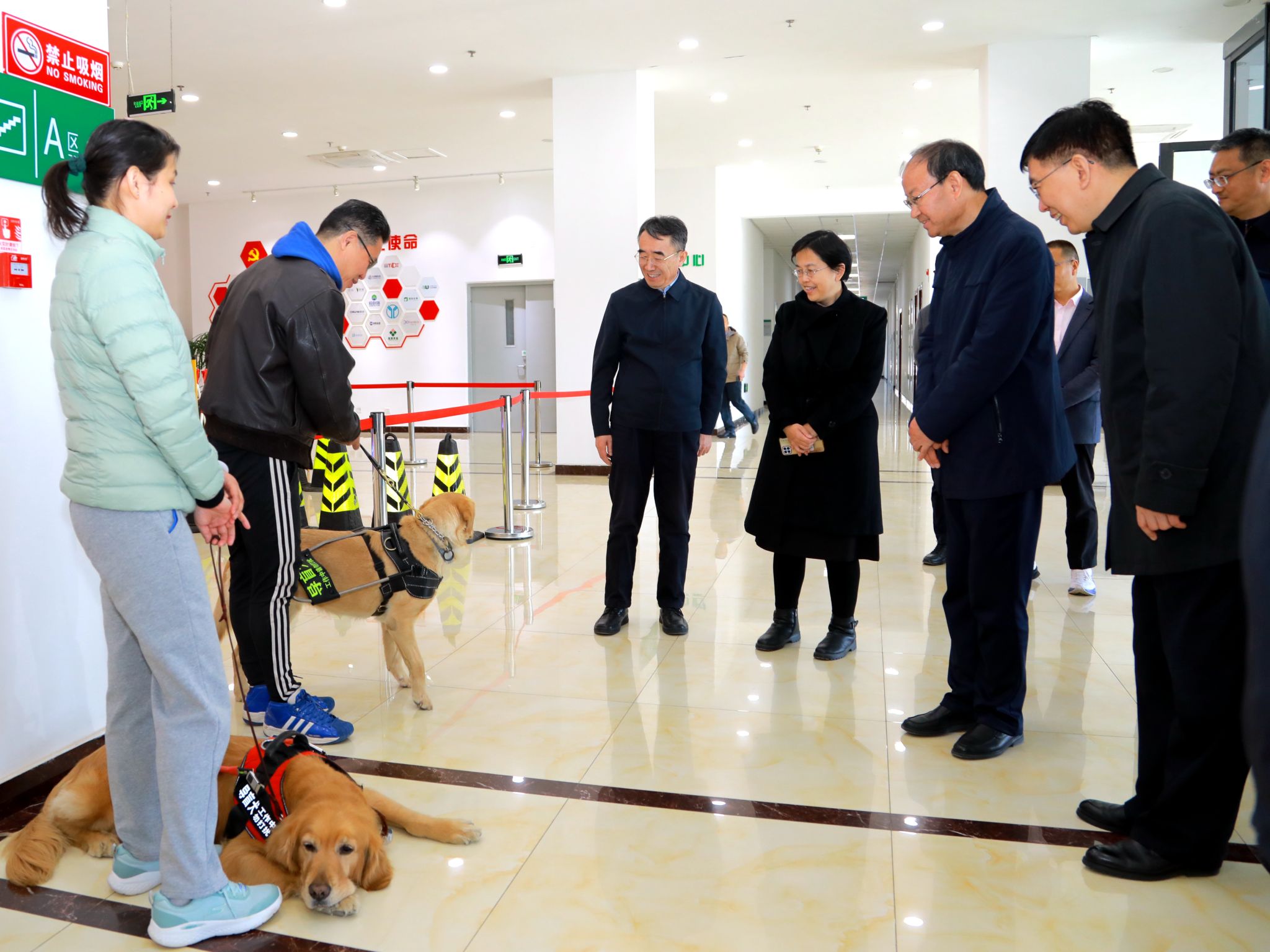 在学校国家大学科技园一层大厅,周长奎一行观看了导盲犬训练演示并与导盲犬使用者深入交流。详细了解视障人士与导盲犬共同生活情况,认真听取大家对导盲犬培训工作及残疾人无障碍环境建设的意见建议。