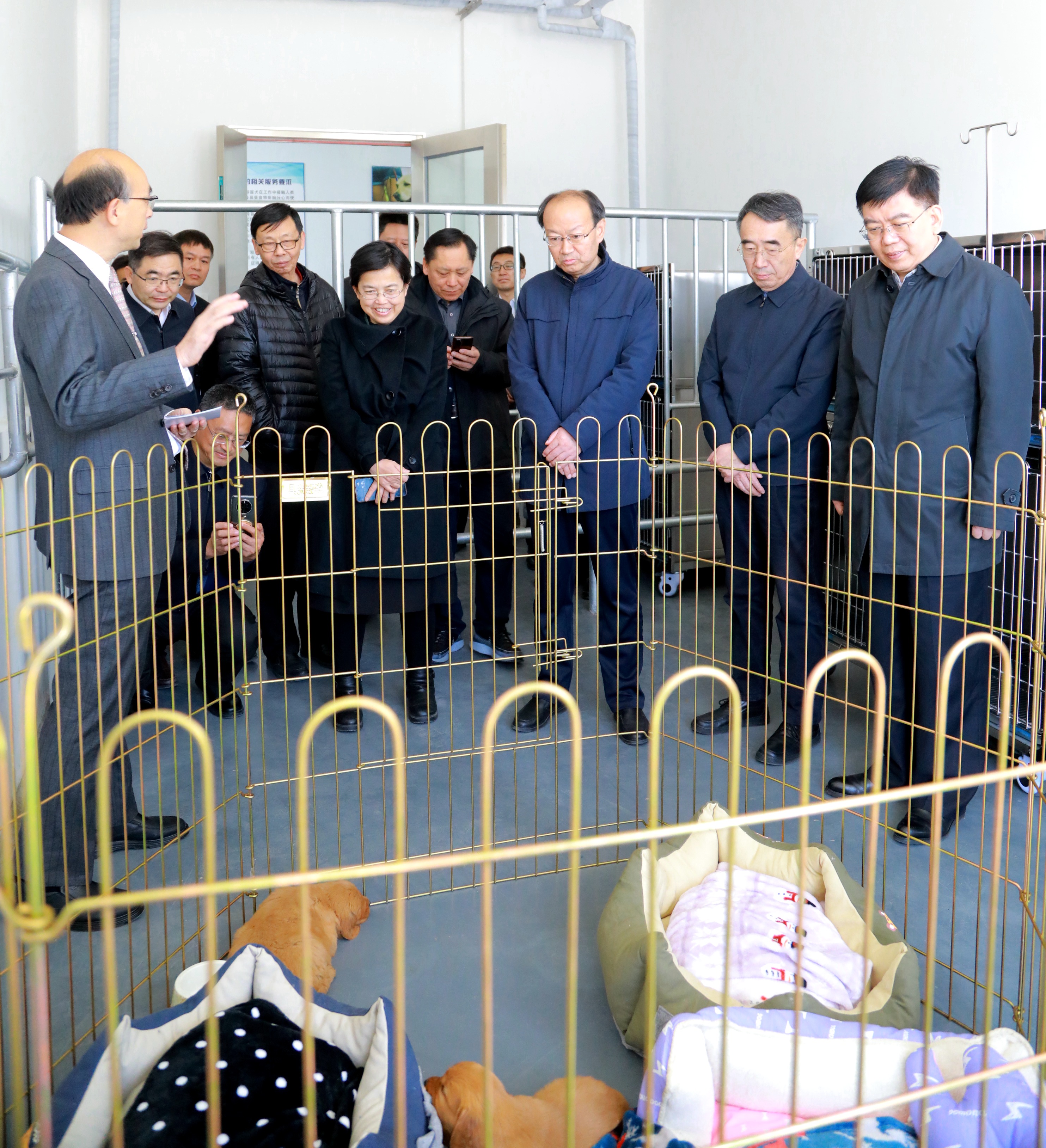 在导盲犬培训示范中心,周长奎一行参观了学校服务乡村振兴和助力残疾人事业发展主题展览。实地察看了犬舍、诊疗室、处置室、中兽医理疗保健室、模拟训练场等,深入了解基地运行情况以及学校围绕导盲犬“繁、育、养、护、医”开展工作的情况,对学校师生发挥学科专业优势、中西兽医结合服务导盲犬事业发展的做法和成效给予充分肯定。