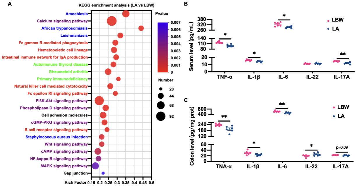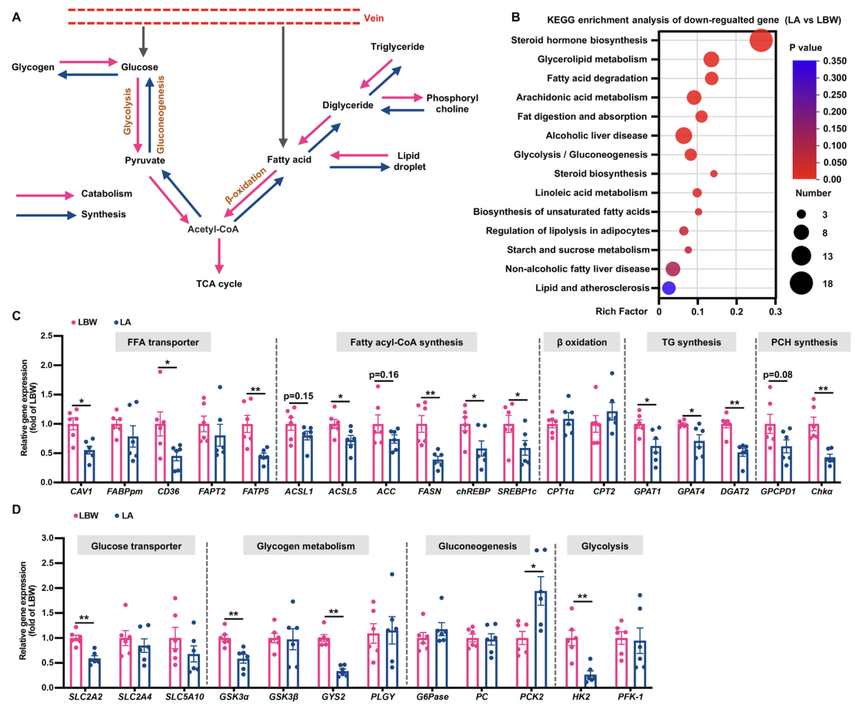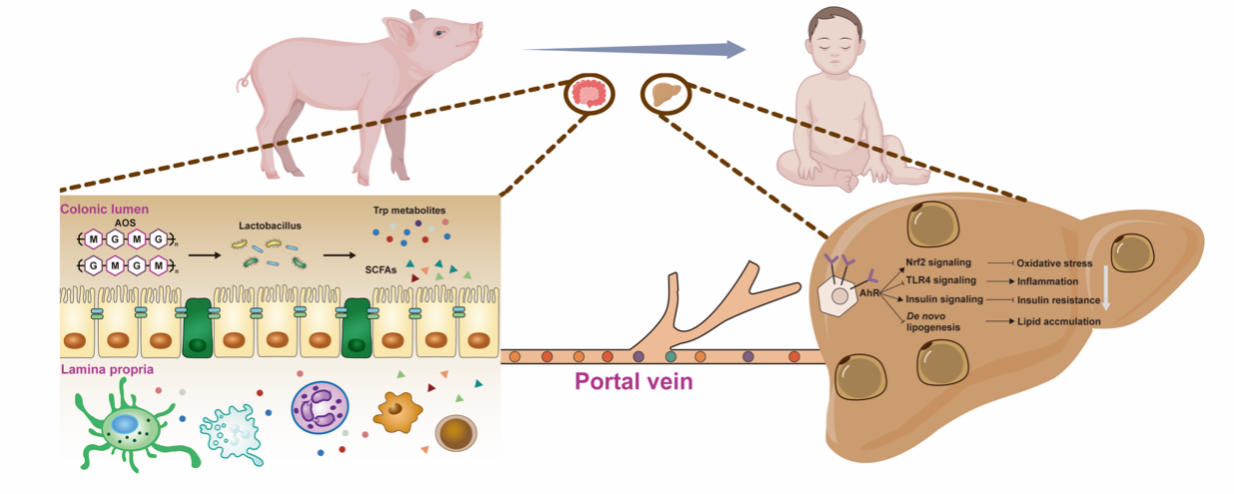 哺乳动物妊娠期间的胚胎及器官生长发育受损,造成胎儿宫内发育迟缓(Intrauterine growth retardation, IUGR)。IUGR导致胎儿出生重量低(Lowbirth weight, LBW)、免疫组织发育不良、消化道组织形态改变、消化酶活性显著降低,以及肝脏糖脂代谢异常,后期往往表现出生长迟缓与发育不良,是威胁哺乳动物健康的重要因素。AOS是从海洋藻类中提取出的一种功能性寡糖,具有多种生物学功能,如调节免疫、抗氧化、抑菌和优化肠道菌群等,目前已被农业农村部批准为国家I类新饲料添加剂产品。研究以LBW仔猪为模型,饲喂AOS改善LBW仔猪结肠黏膜免疫应答(图2),抑制肝脏脂质合成和改善葡萄糖代谢(图3)。多组学联合分析揭示AOS通过提高肠道乳酸杆菌丰度,促进色氨酸代谢、短链脂肪酸生成以及芳香烃受体激活,发挥调节肠黏膜免疫和肝脏糖脂代谢的作用。