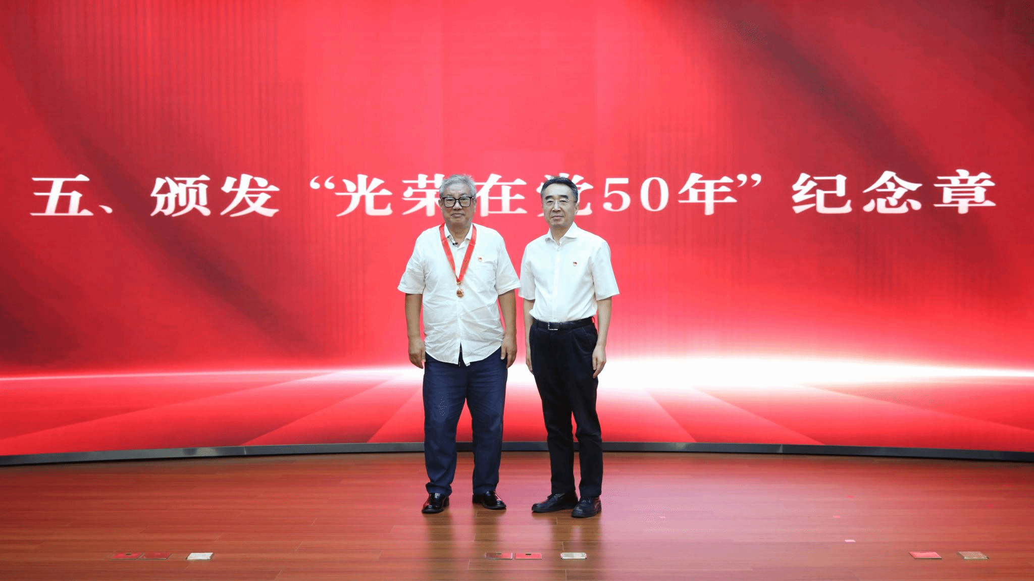 赵锋为“光荣在党50年”老党员朱生利颁发纪念章。