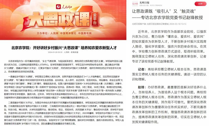 构建“大思政”育人格局。坚决贯彻落实中央和市委关于思政课改革创新的部署和要求,打造“首善标准、红色基因、北农特色”的思政金课,全面推进习近平新时代中国特色社会主义思想“三进”工作,大力推进“四史”教育融入思政课教学,获评北京高校精神文明建设“十佳案例”。2门课程思政案例获评“全国高等农林院校课程思政建设研讨会”优秀教学案例,3个项目获评“北京高校思想政治工作创新示范项目”,6个项目全部被评为2023年度北京高校师生服务新时代首都发展“双百行动计划”优秀示范项目,在全市高校名列第一。