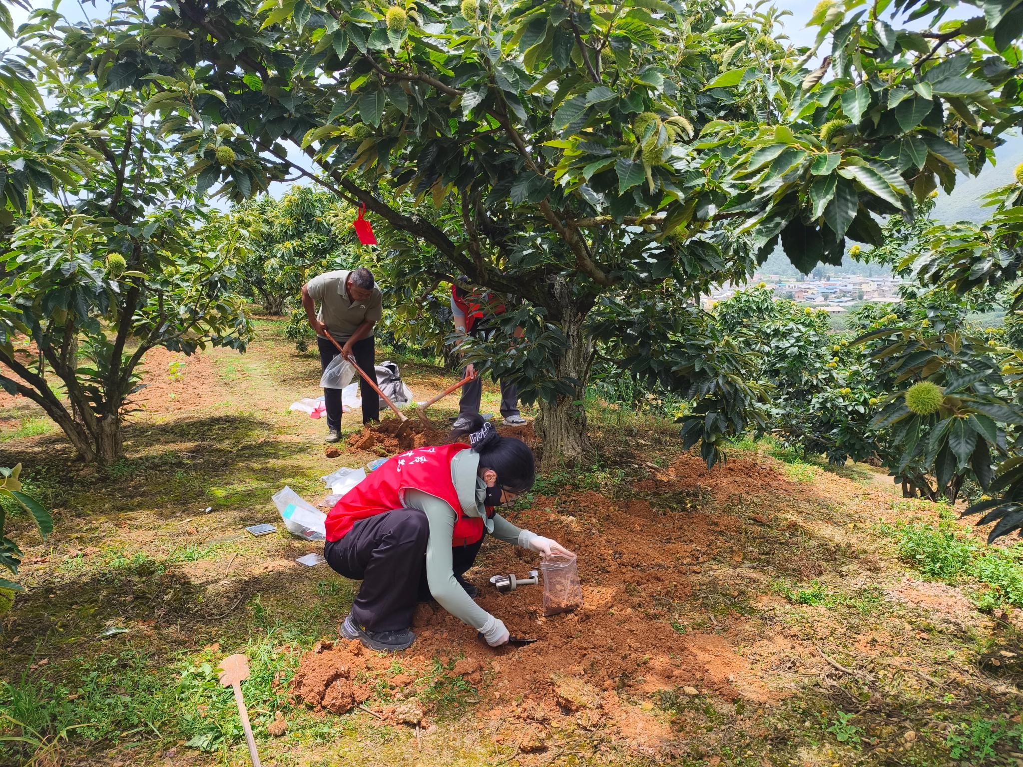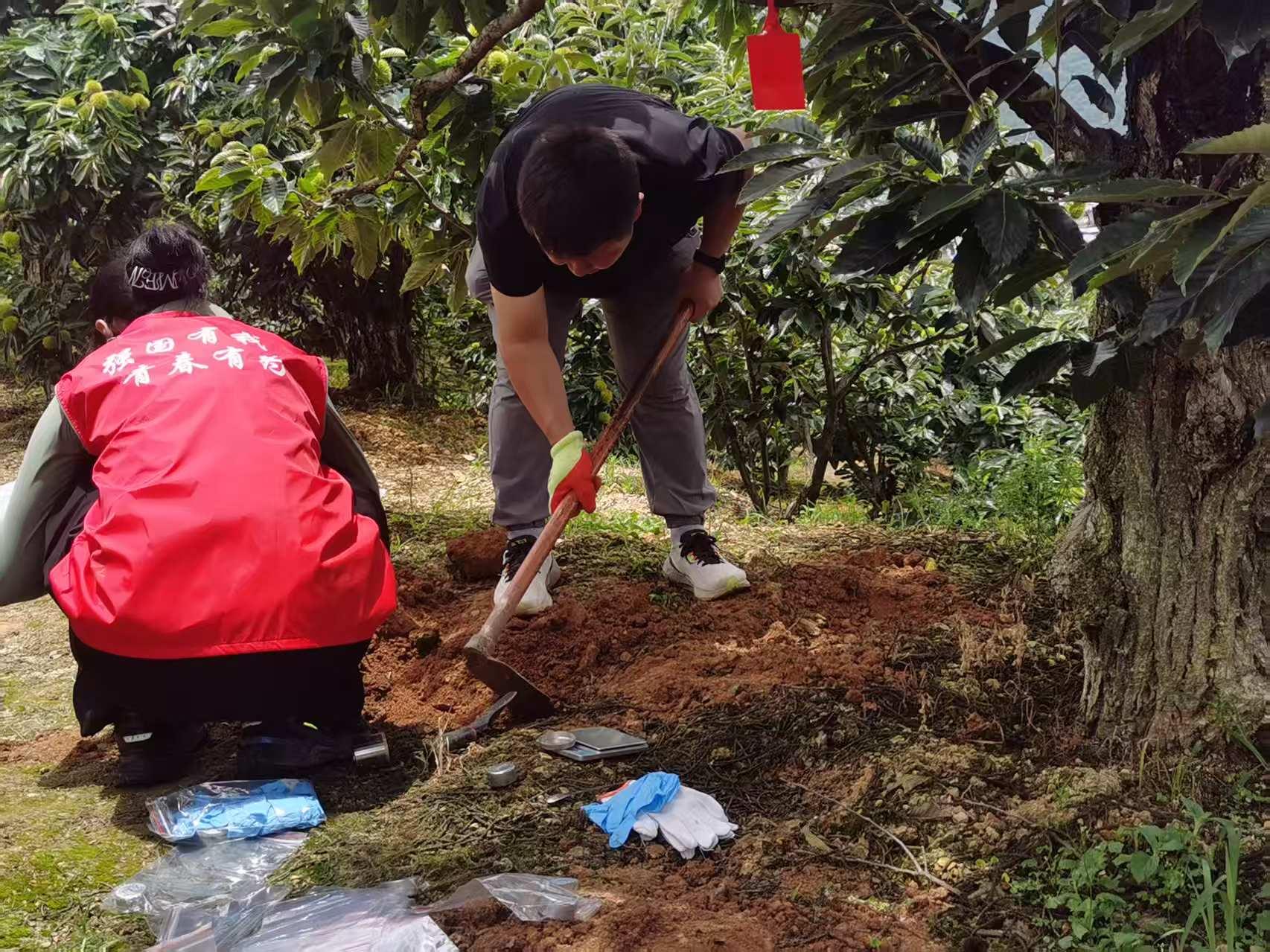 云南省作为我国板栗成熟期最早的产区,板栗年产量达20多万吨,占全国总产量的8.56%,在全国板栗产业布局中占据重要地位。世界杯官网选育的国审板栗良种“京暑红”因成熟期早、品质优良,深受当地栗农认可与青睐。在板栗示范园现场,实践团采集引种的北方品种“京暑红”“燕山早丰”的果实样本及土壤样品,通过后续实验室数据分析,深入探究主栽品种在南北方不同生态条件下的结果习性和品质差异,为板栗的引种提供科学依据。