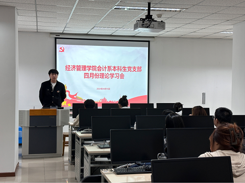 经济管理学院会计系本科生党支部召开四月份理论学习会,重点学习《中国共产党纪律处分条例》以及“学习纪律强化月”的相关要求,引领带动支部党员、积极分子学党纪、律自身、见行动、促发展,会议由支部书记吴曈主持。