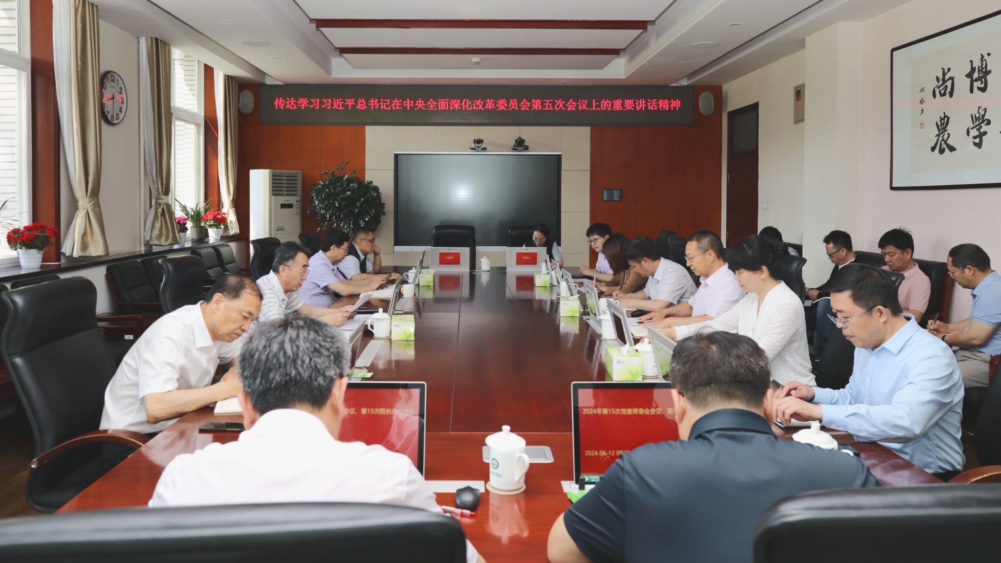 6月12日上午,学校党委常委会召开会议,传达学习习近平总书记主持召开中央全面深化改革委员会第五次会议时的重要讲话精神,强调以新质生产力为引领,以改革创新为动力,坚持用改革的思维和行动解决学校高质量发展中的问题,为更好服务新时代首都发展和“四个中心”功能建设贡献北农力量。会议由党委书记赵锋主持。