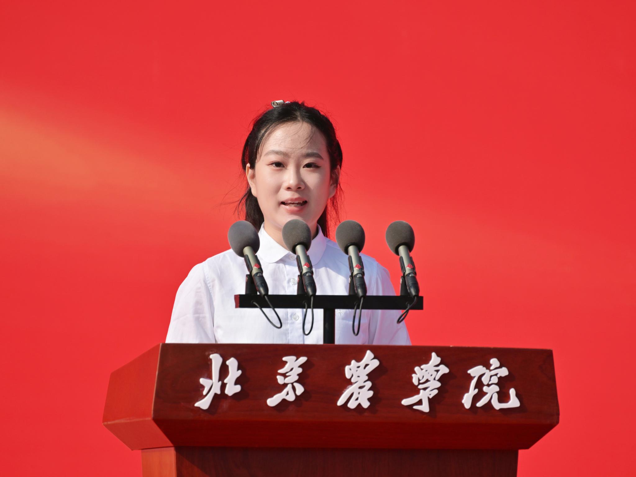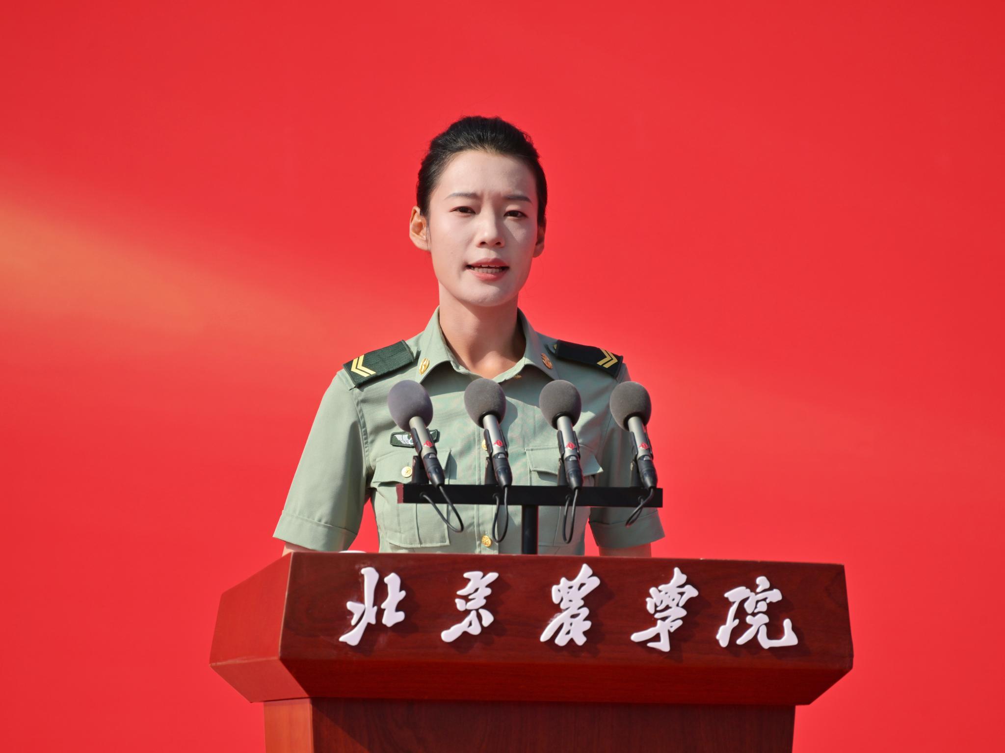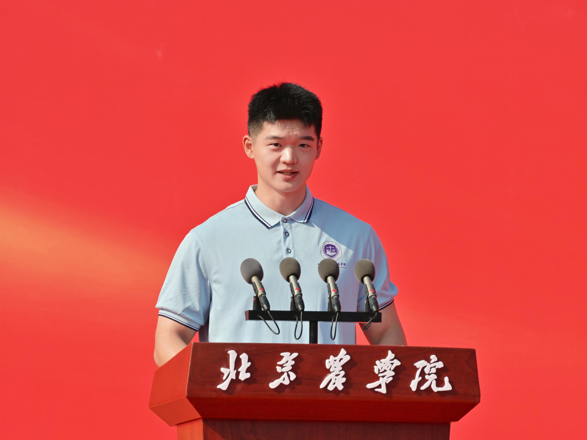 在校生代表、动物科学技术学院2018级动物医学专业的冯晓分享了从参军入伍到参加纪念中国人民抗日战争暨世界反法西斯战争胜利80周年大会的经历,鼓励新生要传承伟大抗战精神,坚定理想、勤于实践、勇于坚持,以实际行动践行“请党放心,强国有我”的青春誓言。