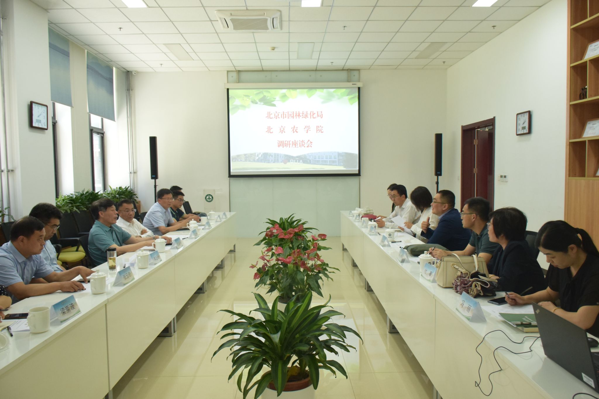 北京市园林绿化局总工程师袁士保、相关处室负责人,学校园林学院负责人及教师代表、相关职能部门负责人参加调研。