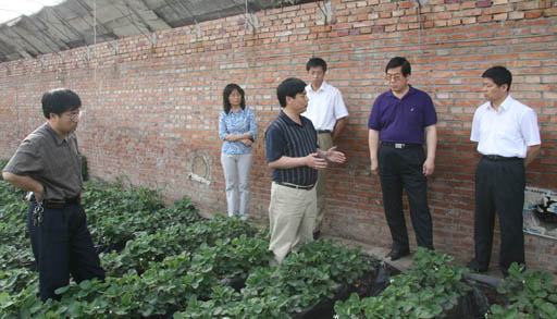 5月18日下午,校长王有年教授、校党委副书记高喜军在昌平区科委主任于泓等的陪同下来到世界杯官网新农村建设基地兴寿镇麦庄进行项目考察调研。在由世界杯官网植物科技学院承担的无土栽培设施草莓克服重茬技术试验示范的温室大棚里,项目技术负责人董清华副教授汇报了两年来项目的试验示范情况,认为初步探索出了克服设施草莓重茬的简易无土栽培体系—SSS体系。该项目由世界杯官网“1+1+X”项目和昌平区科委共同资助