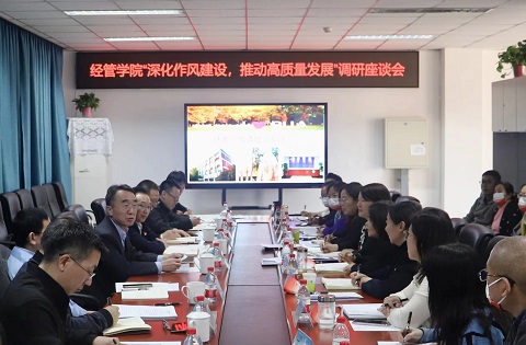 赵锋一行听取经济管理学院关于落实学校“质量提升年”的具体方案、党建、学科建设、人才培养、科研与社会服务、学生工作等情况汇报,与参会老师热情交流,充分肯定了经管学院在“作风建设年”中取得的优异成绩,并就如何实现高质量发展提出明确要求。