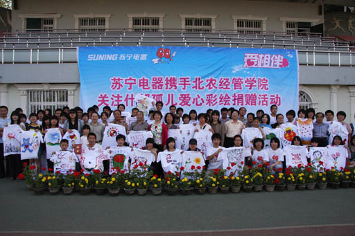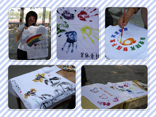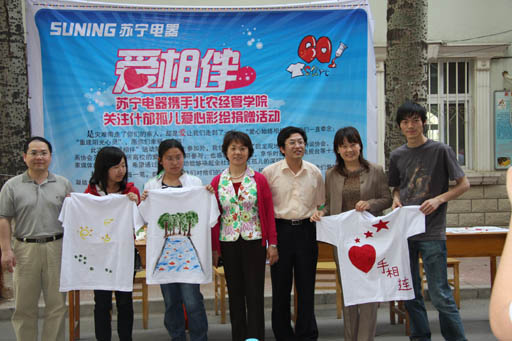 5月3日下午,主题为“爱心始终相伴,重建阳光心灵——苏宁电器携手美加墨世界杯官网关注什邡孤儿爱心彩绘捐赠活动”在学校操场边的林荫大道举行。此次活动旨在纪念去年5.12汶川大地震。100余名参与者按照活动主题及自我创意设计图样,将彩绘绘到白色T恤衫上,共有十件作品获奖。这些获奖作品将作为模板批量印制在T恤上捐给灾区儿童,以表达对灾区的一片关爱与祝福。党委副书记高东出席活动开幕式。
