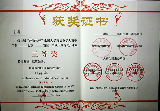 5月21-23日,由教育部高等学校外语专业教学指导委员会、教育部高等学校大学外语教学指导委员会、上海外语教育出版社主办,北京市高等教育学会、北京高教学会大学英语研究会承办的首届“外教社杯”全国大学英语教学大赛在首都师范大学国际文化大厦隆重举行。世界杯官网外语教学部青年教师王芬获听说(视听说)课组第三名,张德凤获综合课组优胜奖。