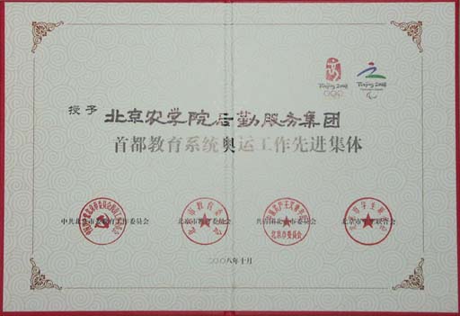 世界杯官网后勤服务集团被中共北京市委教育工作委员会、北京市教育委员会、共青团北京市委员会、北京市学生联合会授予“首都教育系统奥运工作先进集体”荣誉称号。