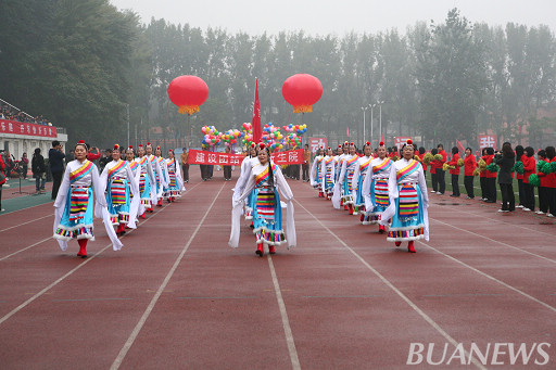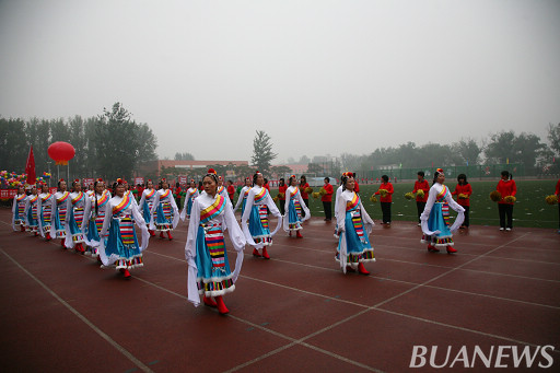 24名身着华美的白色藏族服饰的女教工们,迈着轻盈的步伐,纤细的罗衣随风飘舞,缭绕的长袖左右交横,为大赛增添不少生机。