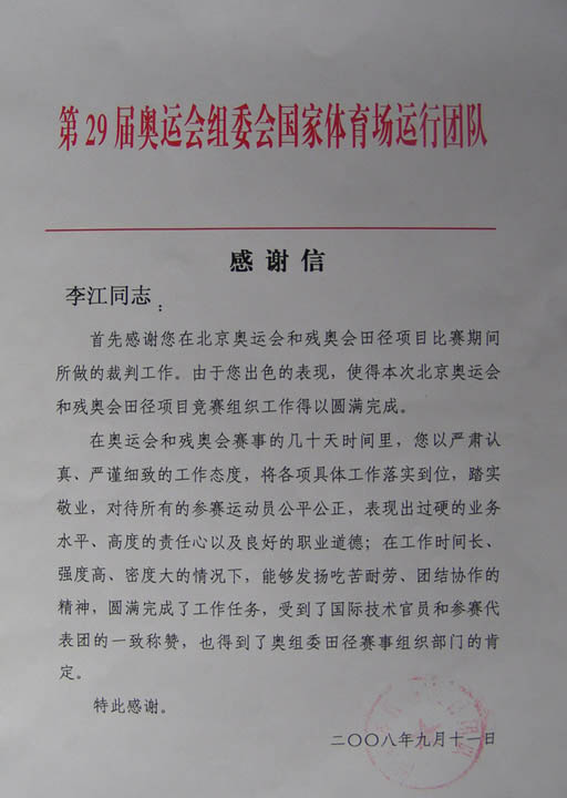 世界杯官网基础教学部李江教授会在北京奥运会和残奥会田径项目比赛期间担任裁判工作,由于表现出色,受到了国际技术官员和参赛代表团的一致称赞,得到了奥组委田径赛事组织部门的肯定,为此,第29届奥运会组委会国家体育场运行团队特发来感谢信表示感谢!