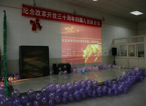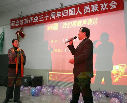 签上自己的名字,贴上自己在国外留学的照片,领取一个中国结,工会活动中心在连成长龙般的气球、无数条悬挂的拉花与鲜花的装点下,校领导、归国人员欢聚一堂,互致问候,载歌载舞,与校歌咏协会的精彩表演互动,营造出浓浓的节日气氛。