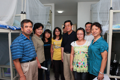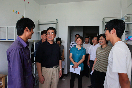 8月26日中午,党委书记王慧敏,校长王有年,党委副书记高东,纪委书记朱生利,以及校长助理、教务处处长范双喜在学生处处长韩宝平等陪同下前往学生公寓7、8、9号楼看望了少数民族及外地新生。