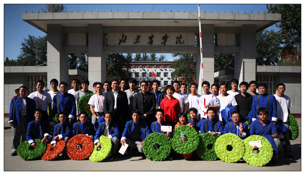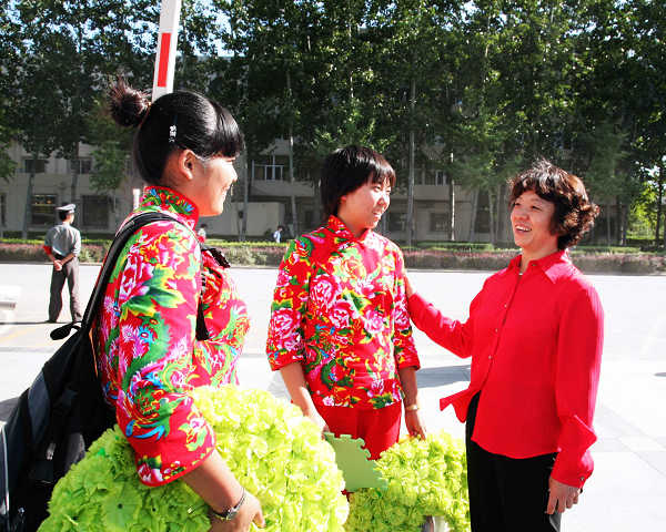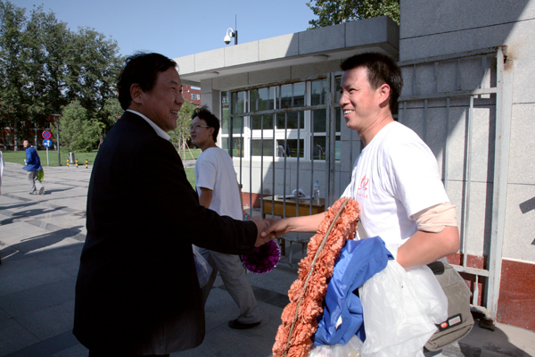 10月1日下午1时,世界杯官网参加国庆群众游行方阵师生圆满完成任务,胜利凯旋,校长王有年、党委副书记高东、副校长杜晓林亲自到校门外迎接。