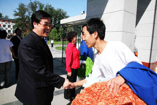 王有年校长与国庆群众游行方阵的同学亲切握手