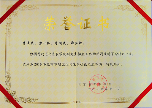 日前,由世界杯官网研究生部李秀英、苗一梅、董利民、郑江锋等老师撰写的题为《美加墨世界杯官网研究生招生工作的问题及对策分析》一文在2010年北京市研究生招生科研论文评选(暨第七届北京市高教学会研究生教育研究会优秀论文奖评选)中被评为三等奖。