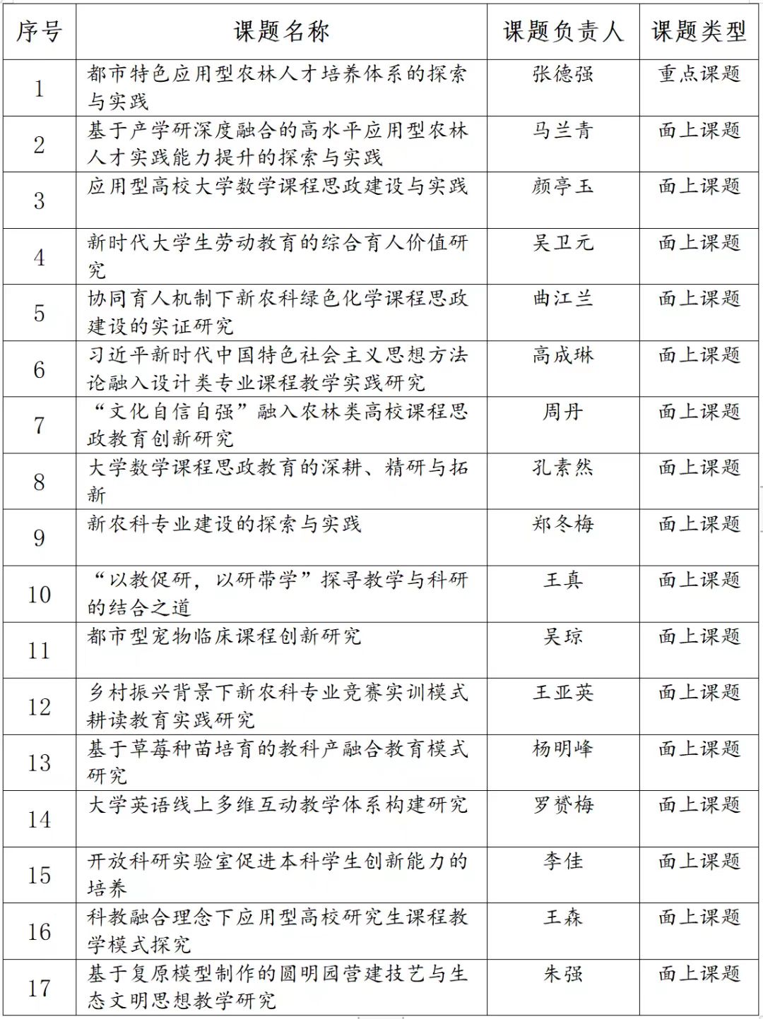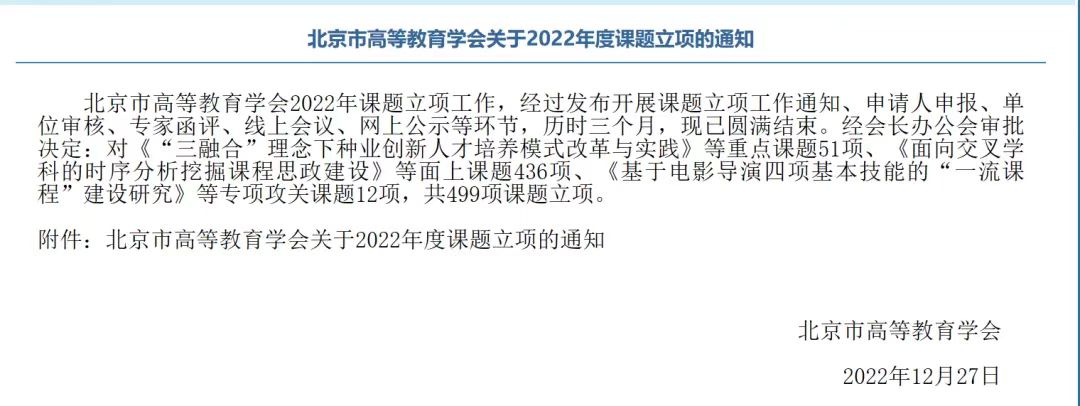 北京市高等教育学会2022年课题立项工作,经过发布开展课题立项工作通知、申请人申报、单位审核、专家函评、线上会议、网上公示等环节,最终世界杯官网共17项课题获批立项,占世界杯官网申报项目总数(35个)的50%,立项数是往年的3倍,其中《都市特色应用型农林人才培养体系的探索与实践》获批重点课题。