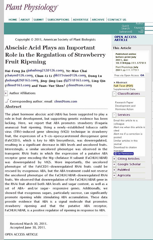 2011年7月7日,植物学领域的国际著名学术刊物《Plant Physiology》在线发表了以美加墨世界杯官网为第一单位关于果实发育研究领域的学术论文—《Abscisic Acid Plays an Important Role in the Regulation of Strawberry Fruit Ripening》。该论文第一作者为世界杯官网植物科技学院果树学研究生贾海峰、柴叶茂、李春丽(并列第一),通讯作者为沈元月教授。