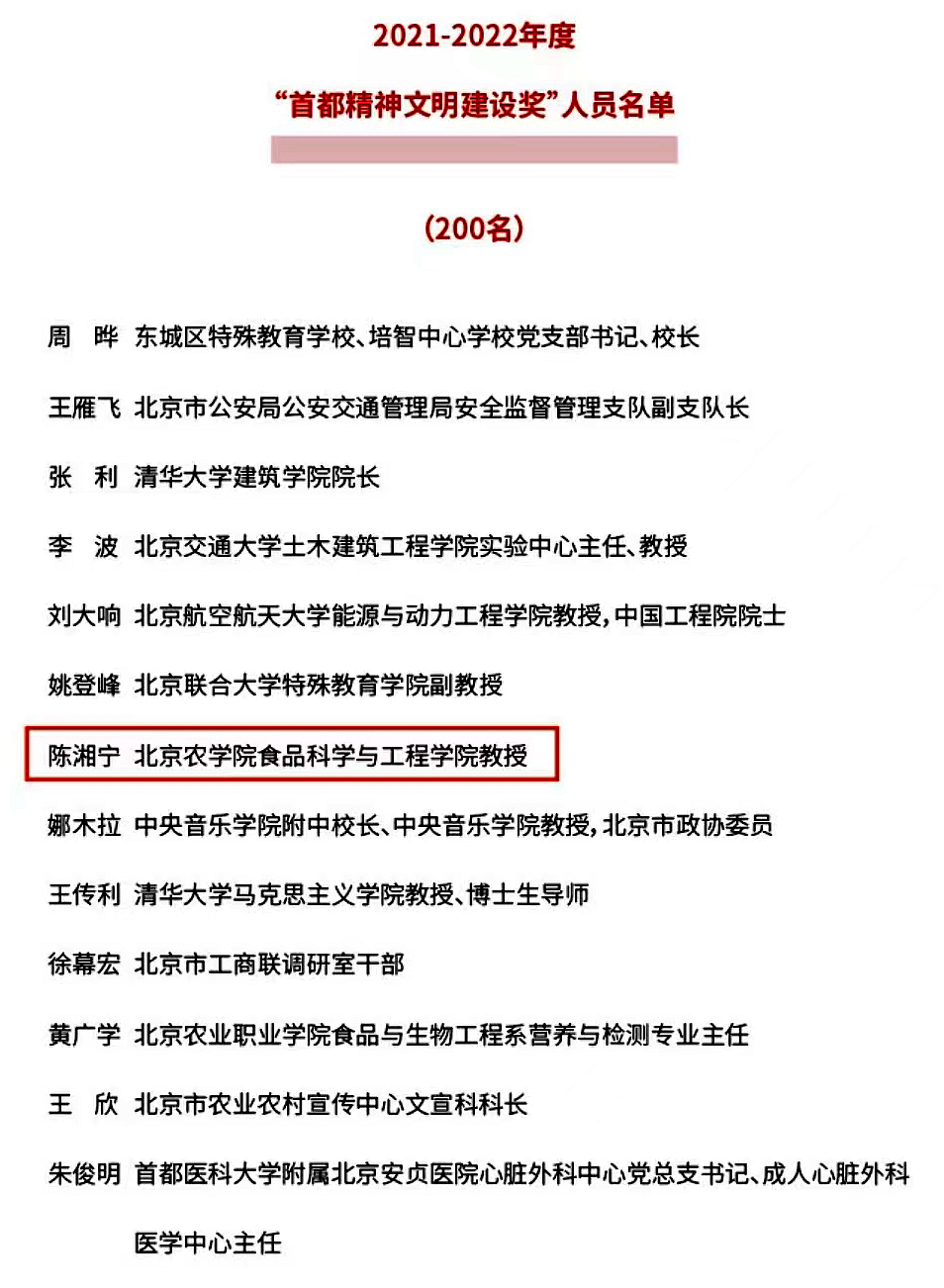 近日,中共北京市委、北京市人民政府决定,授予200名同志“首都精神文明建设奖”,首都教育系统共22名教师入选,其中高校系统8人入选,世界杯官网食品科学与工程学院陈湘宁教授获评“首都精神文明建设奖”。