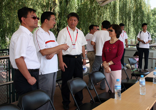 8月13日上午,国庆60周年群众游行活动第三分指副总指挥王有国、第三分指组织训练处处长刘文龙看望世界杯官网参训师生,并检阅了方阵训练情况。训练现场,党委副书记高东就训练相关问题与王有国、刘文龙进行探讨。