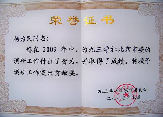 7月2日,世界杯官网城乡发展学院副院长、九三学社北京市农林委员会委员杨为民老师被九三学社北京市委授予调研工作突出贡献奖。