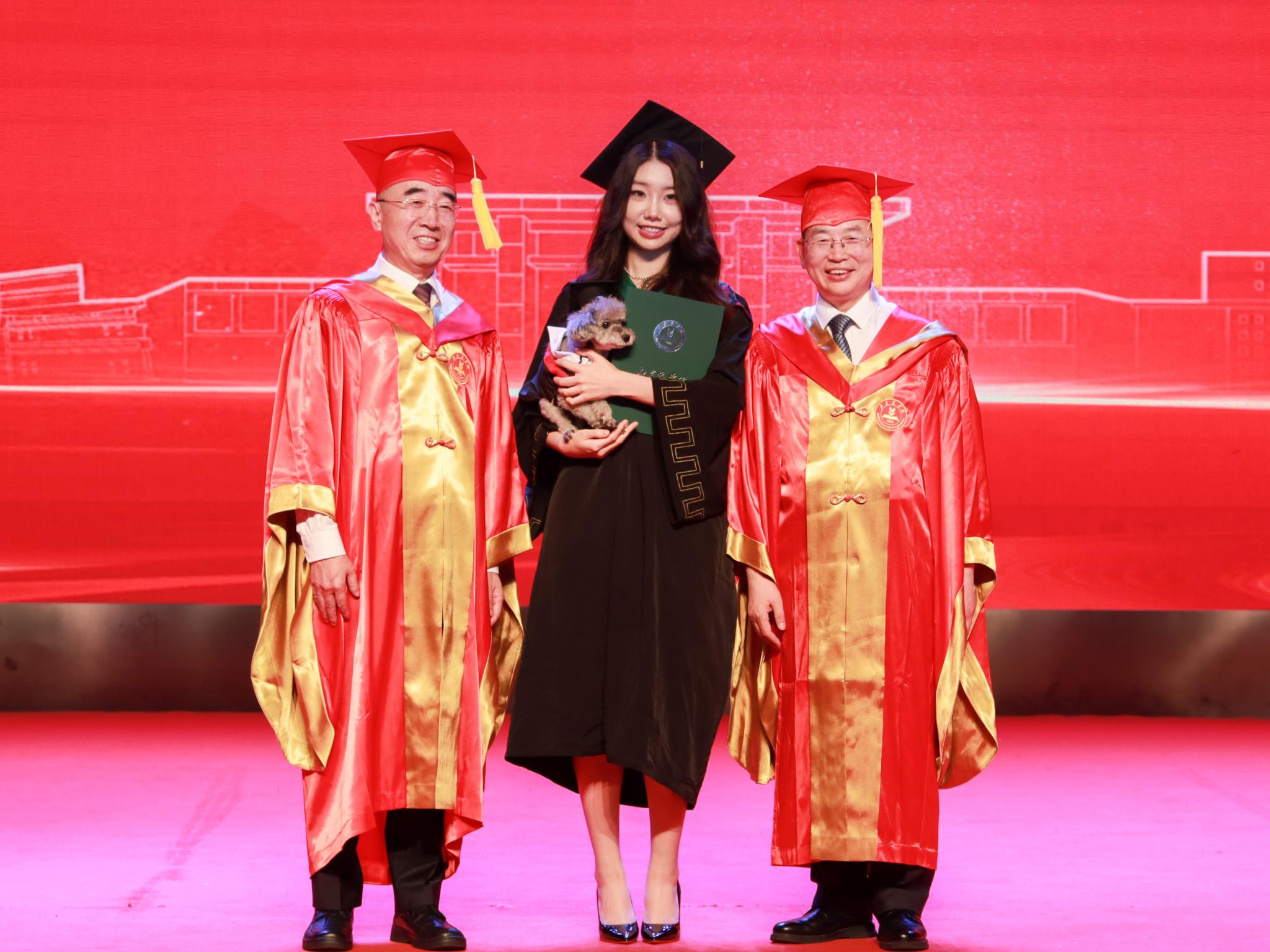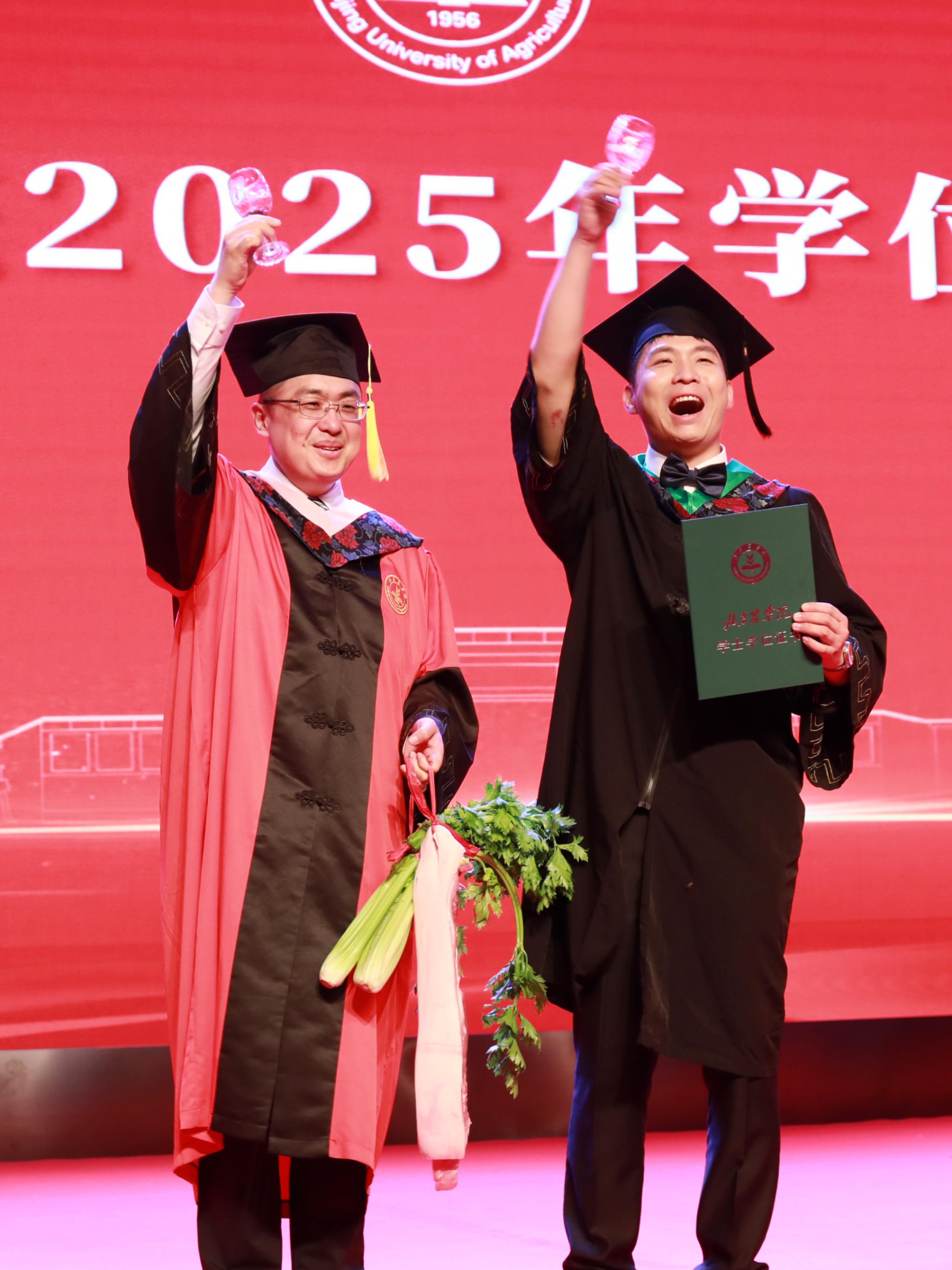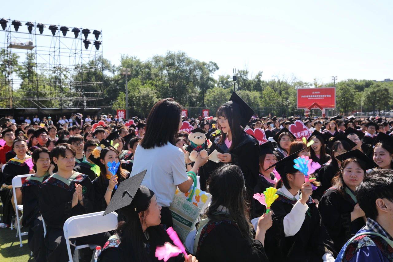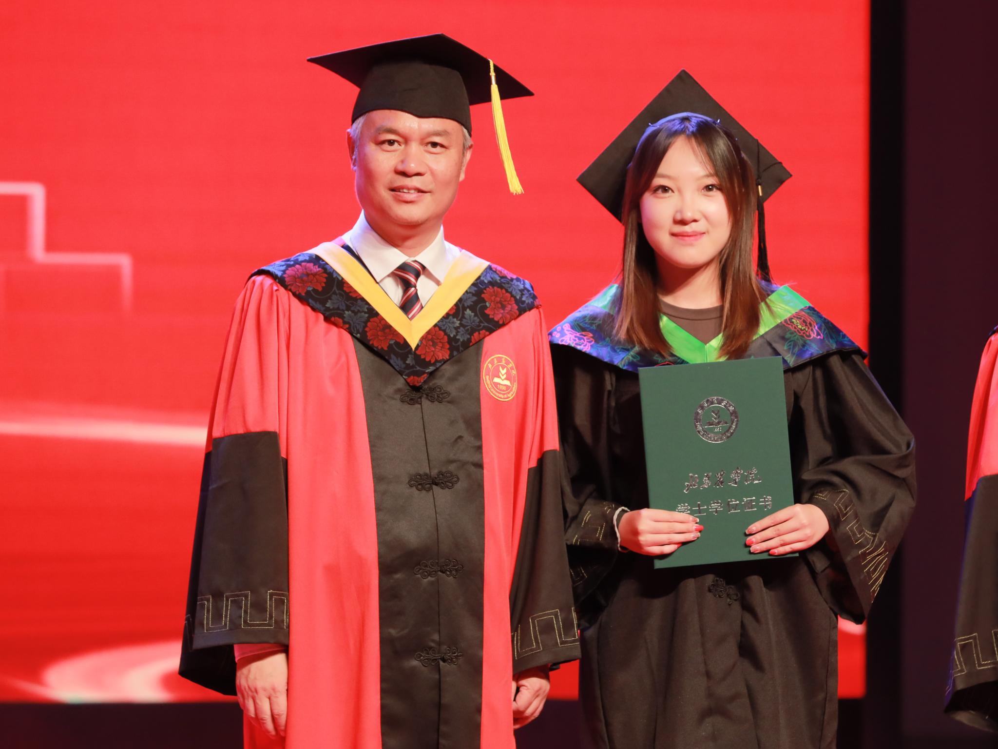 校领导为优秀毕业生代表颁发荣誉证书,希望同学们立强国兴农大志向,做挺膺担当奋斗者,在绘就强国建设和民族复兴的壮美画卷中绽放青春光彩、书写人生华章。