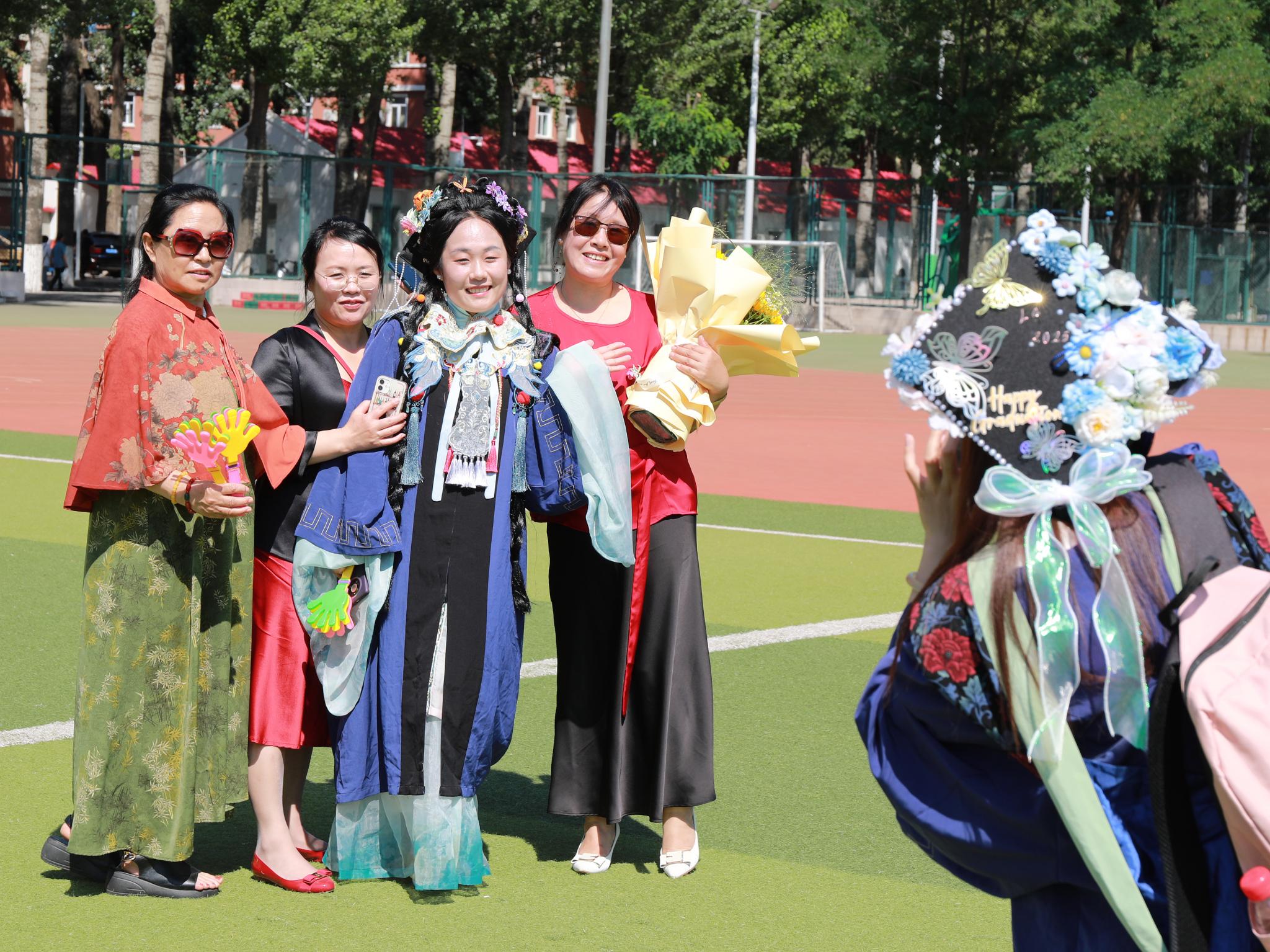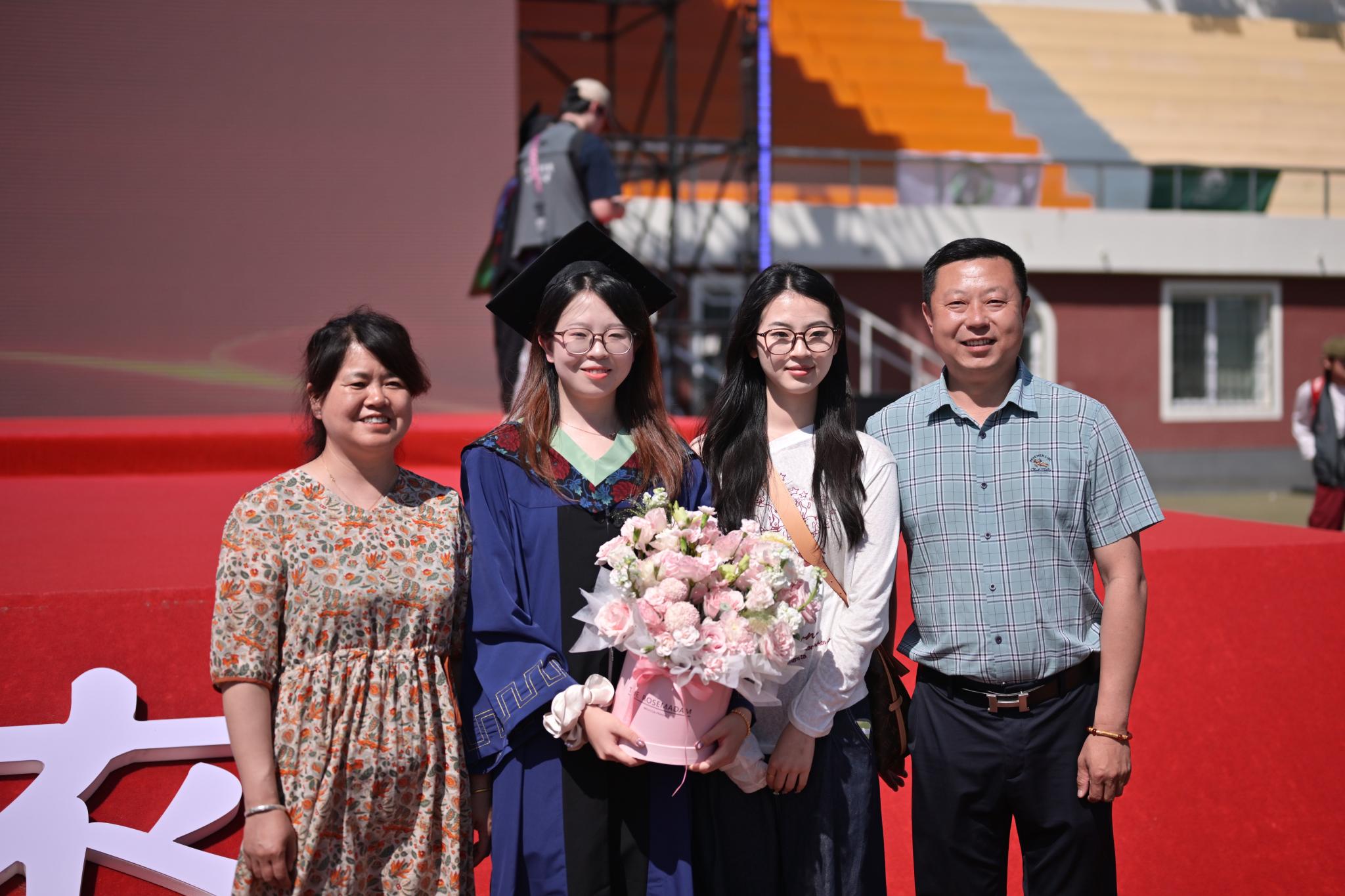 毕业生代表向家长、导师、班主任和辅导员、宿管阿姨、医护人员、保安代表献花,感谢家人、老师以及全体教职员工的关心支持、悉心培养和辛勤付出。