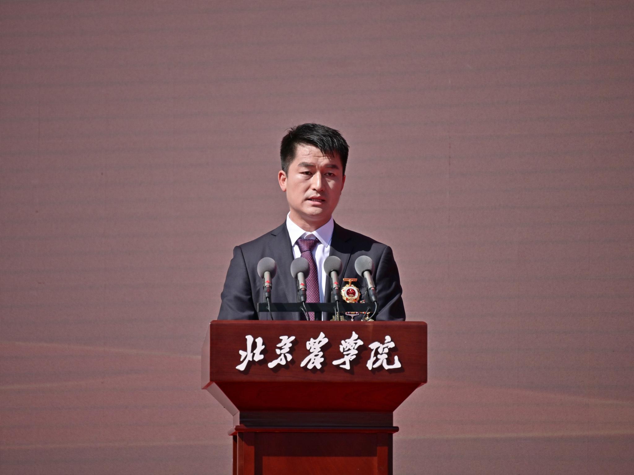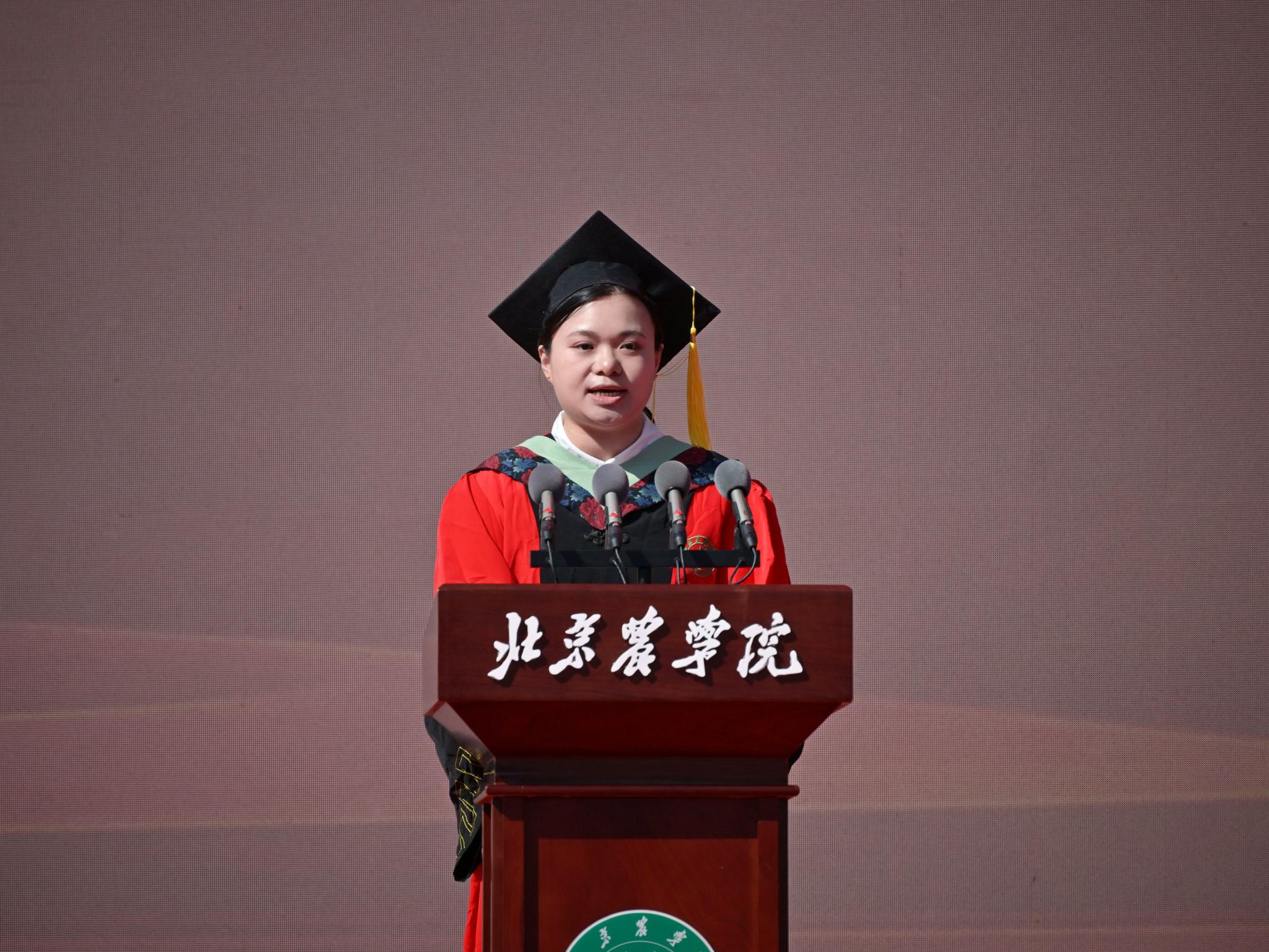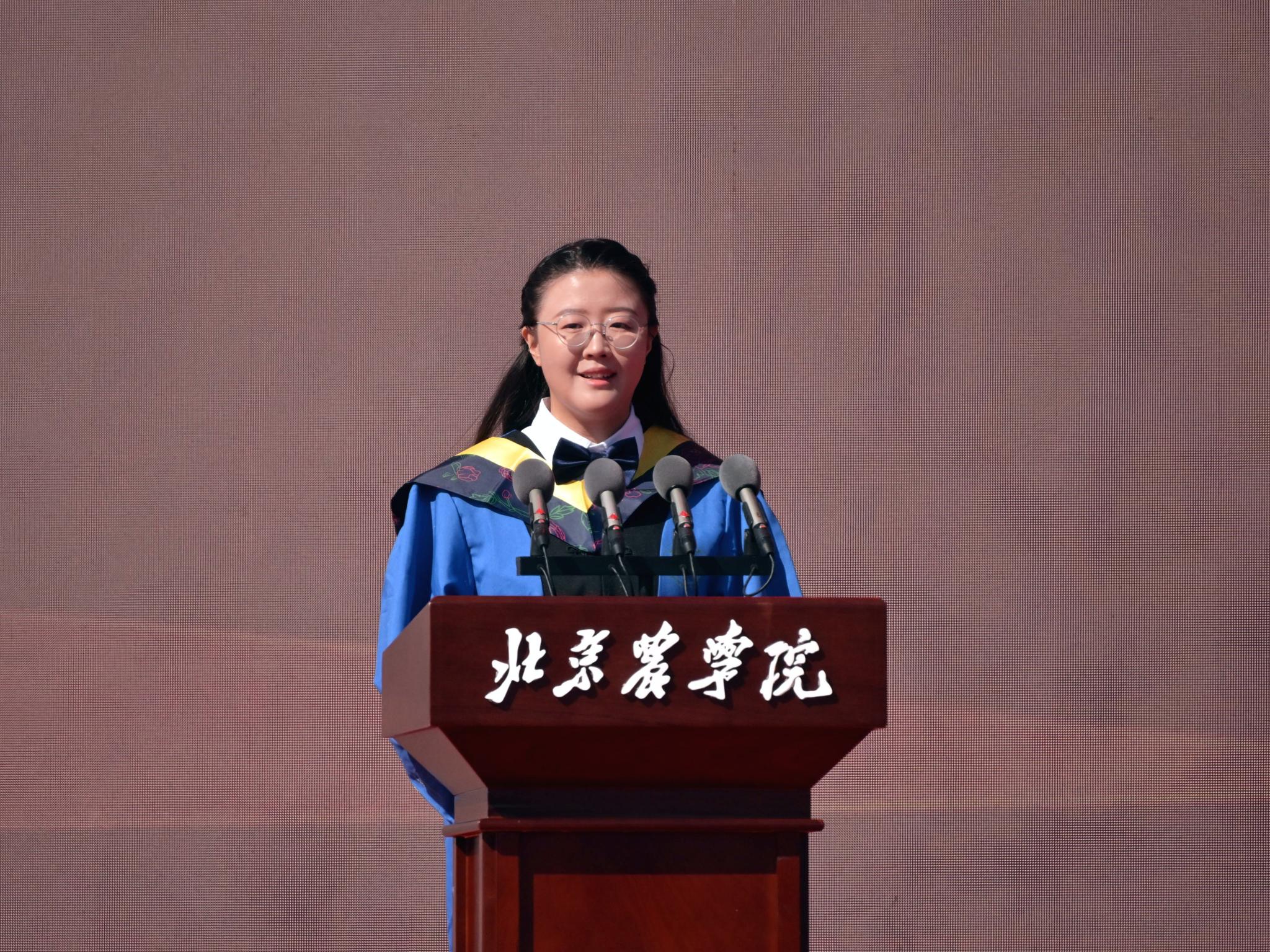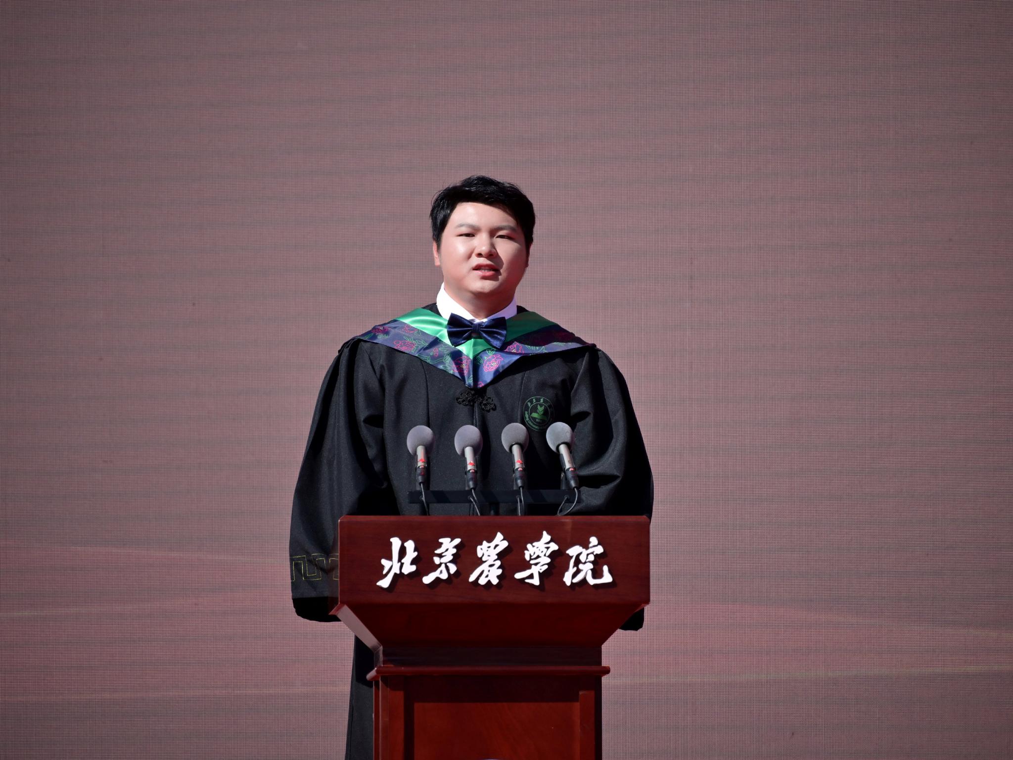 本科毕业生代表、生物与资源环境学院王梓豪同学代表同学们感谢学校四年的精心培养和老师们的悉心教导。他表示,今后将秉持“实干创先”的精神,立志成为一名懂农业、爱农村、爱农民的“新农人”,将论文写在京华大地上,以实际行动为乡村振兴贡献青春力量。