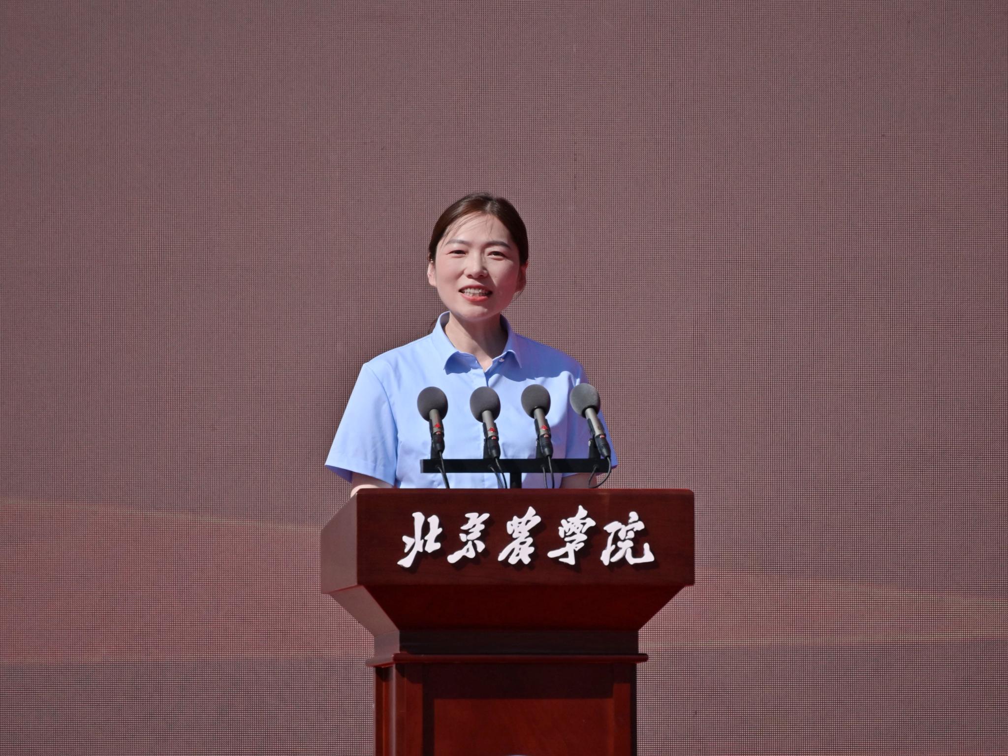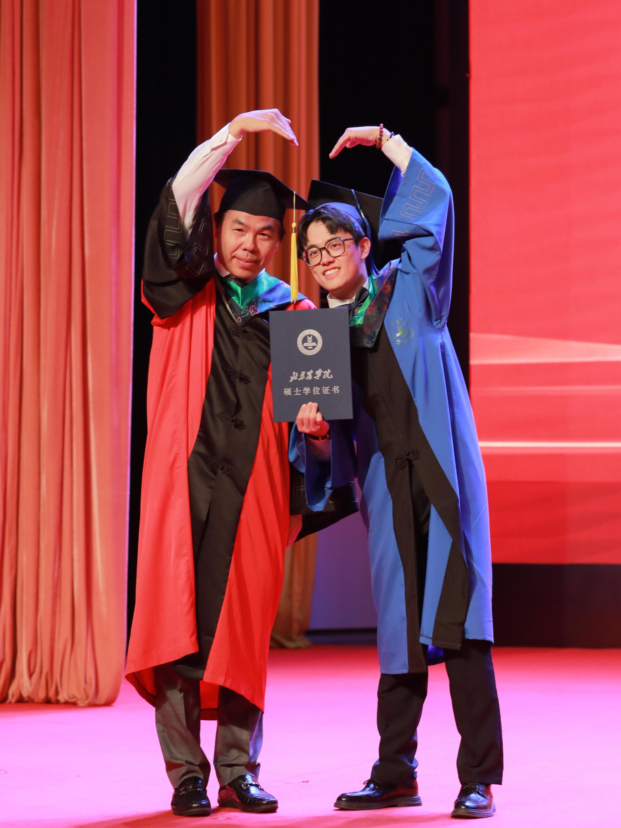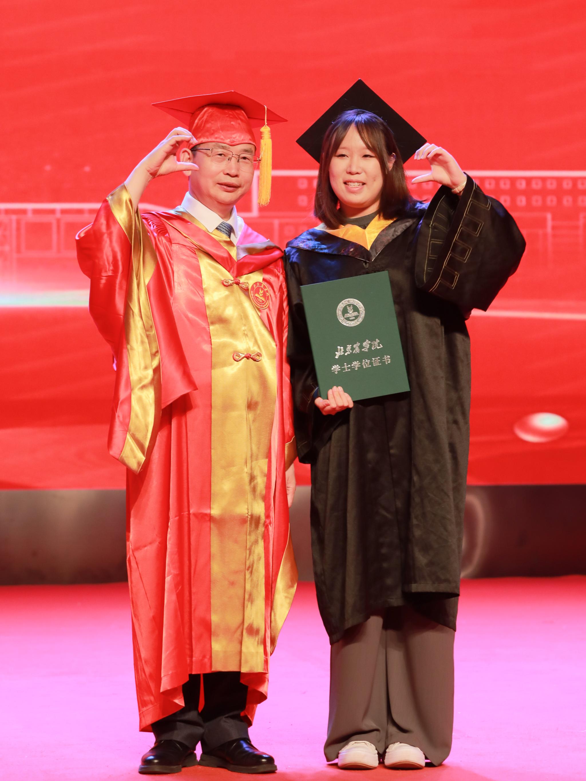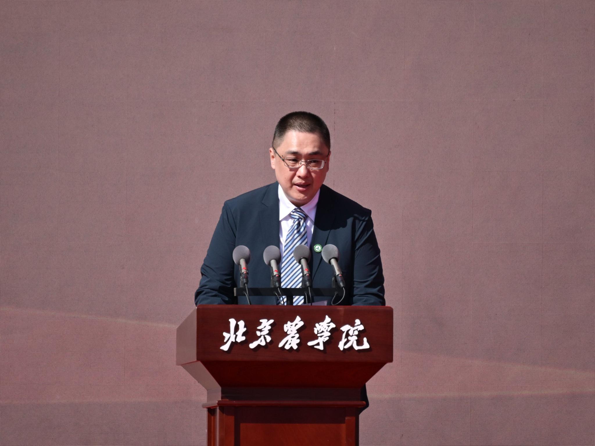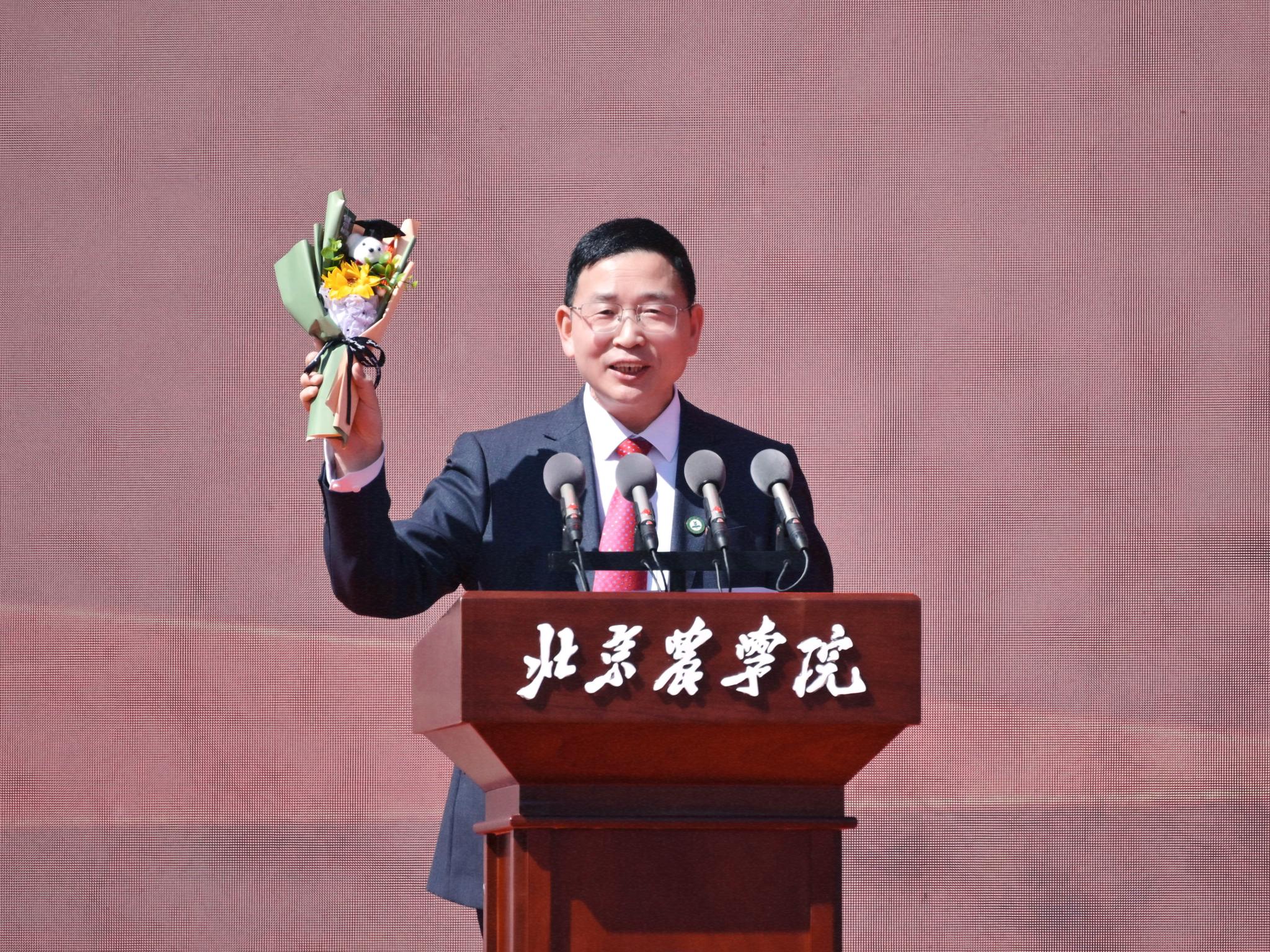 本科毕业生代表、生物与资源环境学院王梓豪同学代表同学们感谢学校四年的精心培养和老师们的悉心教导。他表示,今后将秉持“实干创先”的精神,立志成为一名懂农业、爱农村、爱农民的“新农人”,将论文写在京华大地上,以实际行动为乡村振兴贡献青春力量。