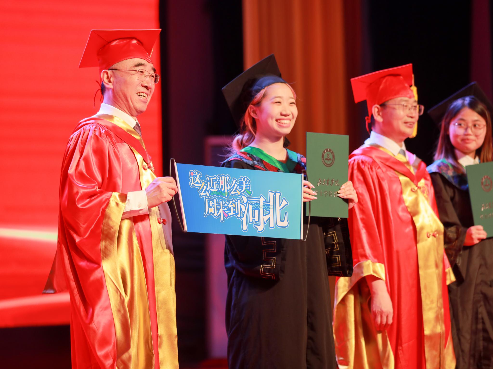 段留生代表学校师生员工为全体毕业生送上殷殷嘱托,希望同学们以“厚德”立身,奋进新时代,谨记校训精神,于平凡中、细微处书写自己的答卷,乘时代之风、翻后浪之勇,让青春在“国之大者”中熠熠生辉、绽放光芒;以“笃行”筑基,淬炼新成长,把艰苦环境、艰巨任务作为磨炼自己的机遇,把肯吃苦、敢吃苦、能吃苦当作成就更好人生的选择,不畏艰辛、笃行实干,在知行合一中蹚出属于自己的精彩篇章;以“博学”致远,学习新本领,践行动态学习、终身学习理念,不断丰富和更新知识体系,持续精进新技能、锻造硬本领,勇做时代的“弄潮儿”;以“尚农”为志,展现新作为,牢记“北农人”身份,以“尚农”之心滋养情怀,以“强农”之行践行担当,在各自岗位顽强扎根、蓬勃生长,汇聚成强国兴农的磅礴力量。