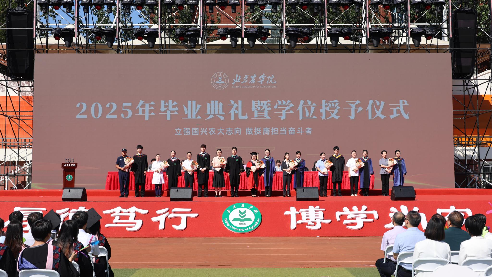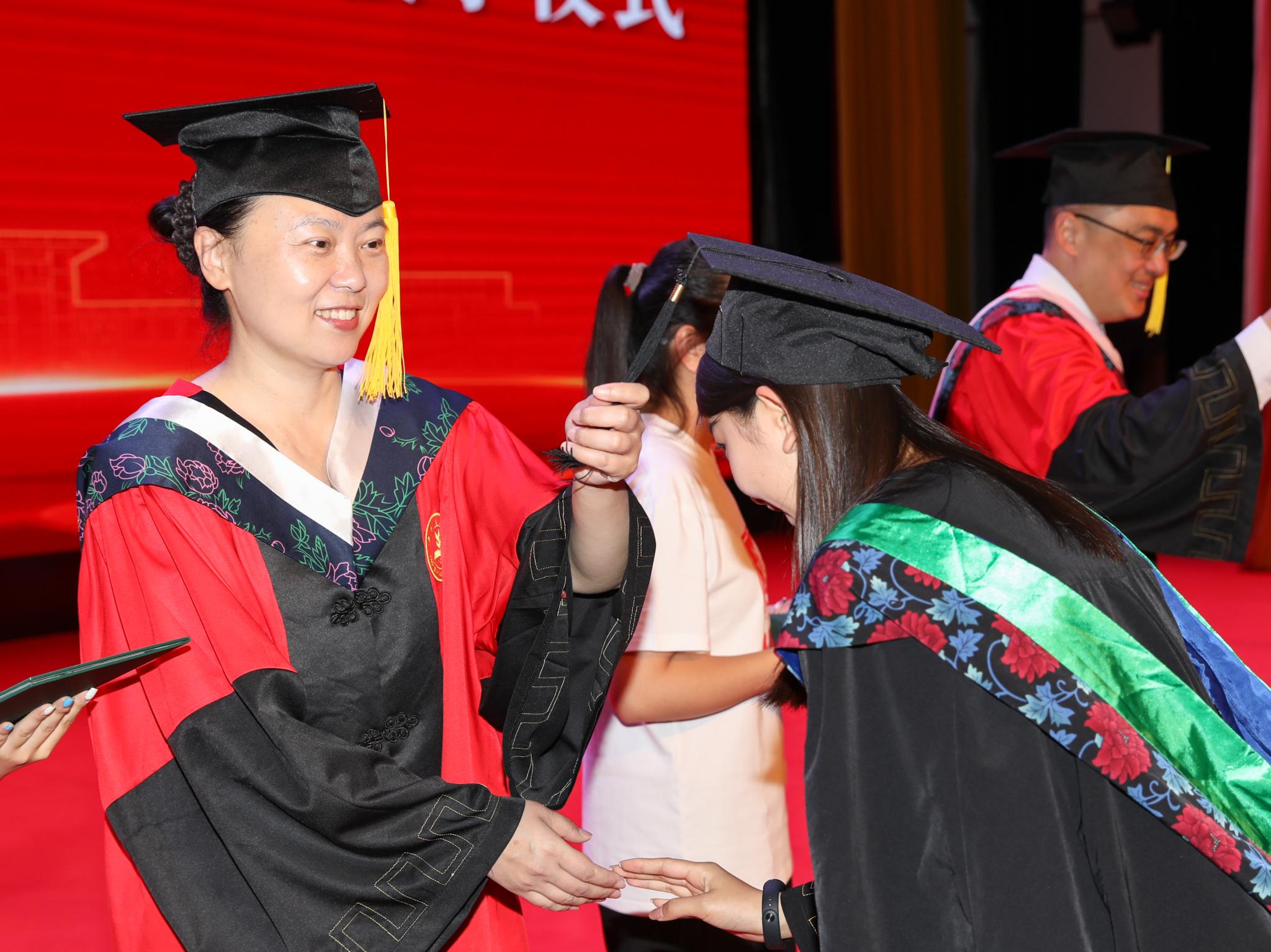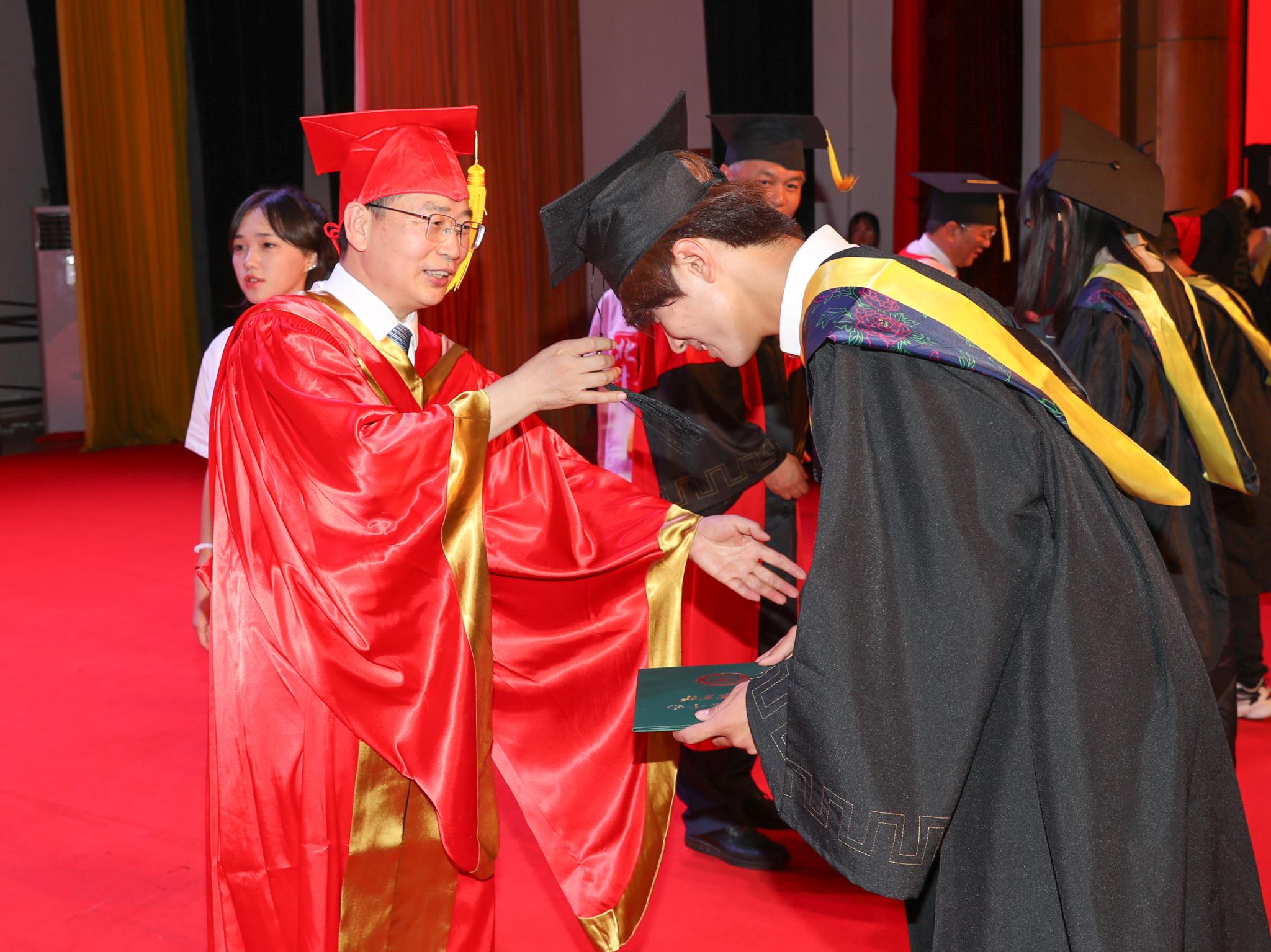 毕业生身着学位服依次庄重地走上主席台,校领导及学院领导满载祝福与嘱托为毕业生一一拨正流苏,愿北农学子在新征程上继续创造属于自己的青春华章!