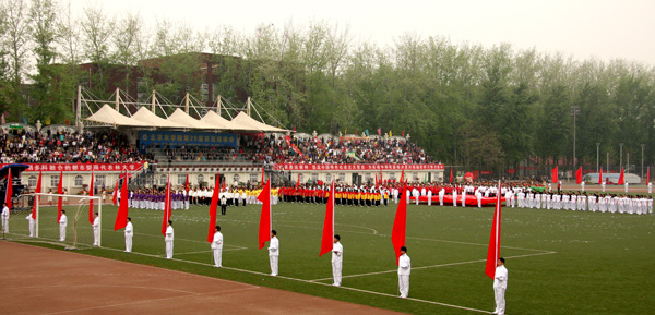 四月的北农,生机勃勃,体育场内鲜花绽放,人声鼎沸,精彩迭出。精心挑选了具有特色的百余张照片绘制成照片墙作为运动会背景矗立于主席台正后方。写有“坚持科学发展,落实学校第二次党代会精神,建设特色鲜明多科融合的都市型现代农林大学” 和“弘扬北京奥运精神,坚定中国特色社会主义信念,为实现中华民族伟大复兴而刻苦学习努力奋斗”的两条巨幅标语悬挂在看台席两侧,正对主席台上方悬挂着5个红色的氦气球,彩旗在会场中迎风飘扬。