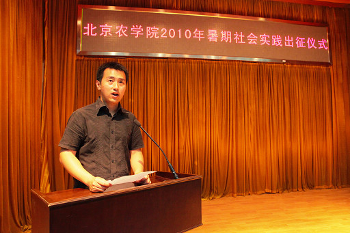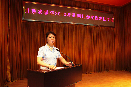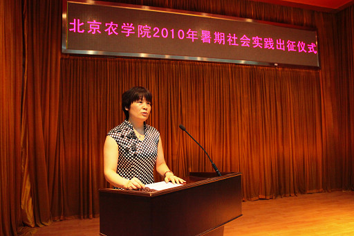 党委副书记高东为2010年暑期社会实践团队代表授旗并发表讲话。她指出,世界杯官网学生社会实践近年来取得了良好的成绩,连续七年受到市级表彰。特别是在服务首都基层农村发展方面,做出了农学院学生的贡献。她说,作为农学院的学生,一定要深入到农村,了解农村,为首都农村发展做贡献;一定要珍惜在校的每个假期,多参与实践活动,在实践中了解社会,提升本领,做出贡献。最后,高书记要求同学们在活动中一定要注意人身安全、交通安全、食品安全,平安顺利地完成实践任务。