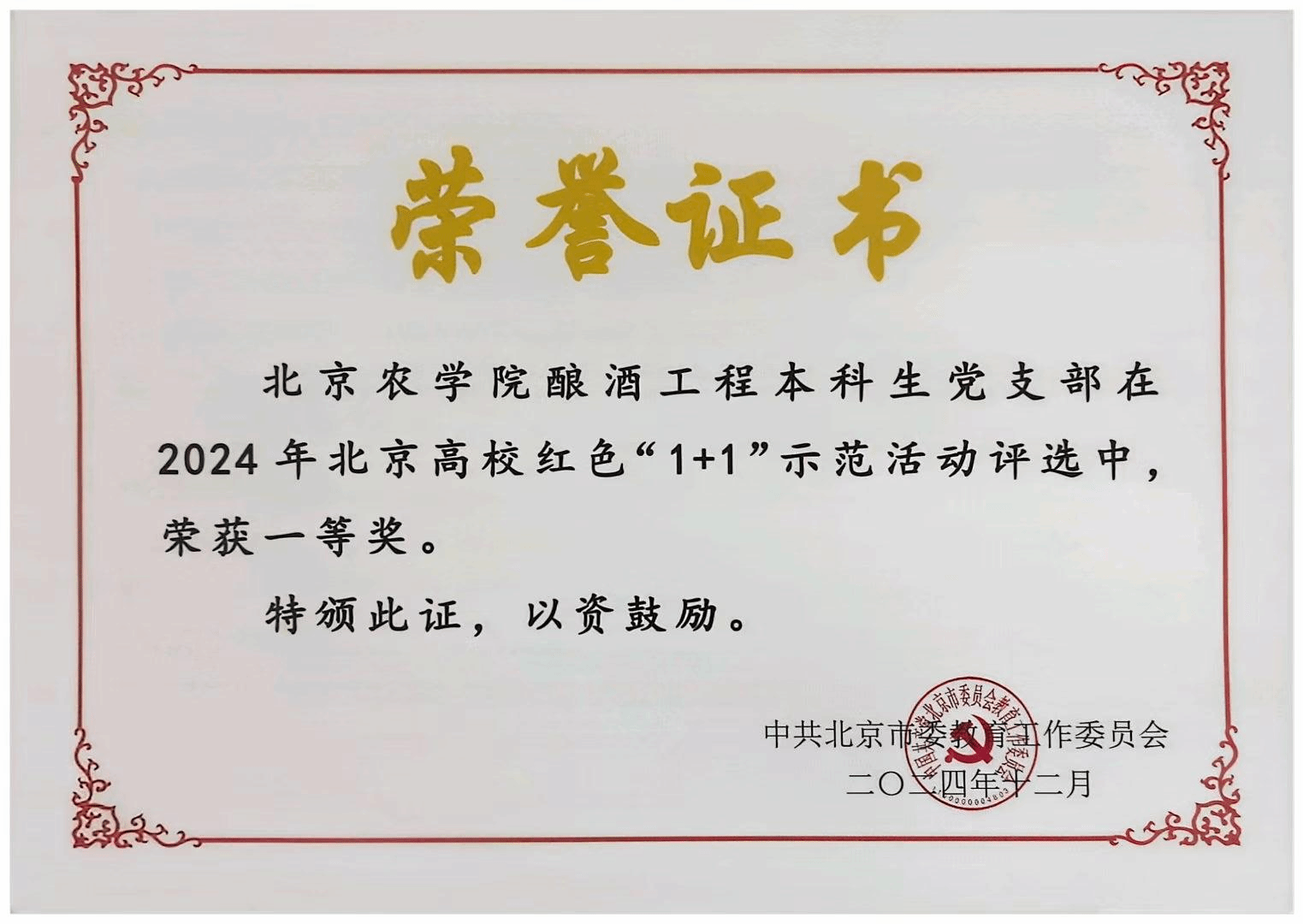 近日,由中共北京市委教育工作委员会主办的2024年北京高校红色“1+1”示范活动展示交流评选结果揭晓,世界杯官网食品科学与工程学院酿酒工程本科生党支部进行现场展示并荣获一等奖。
