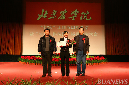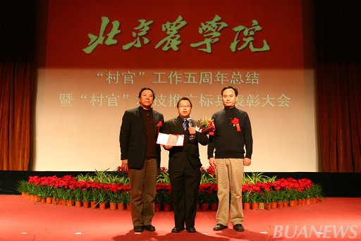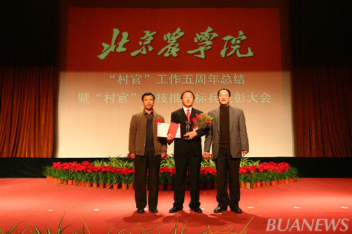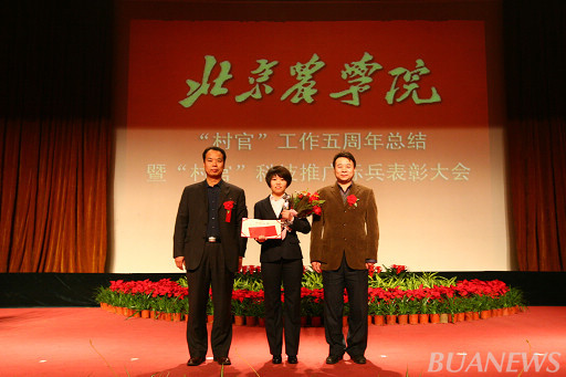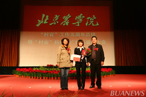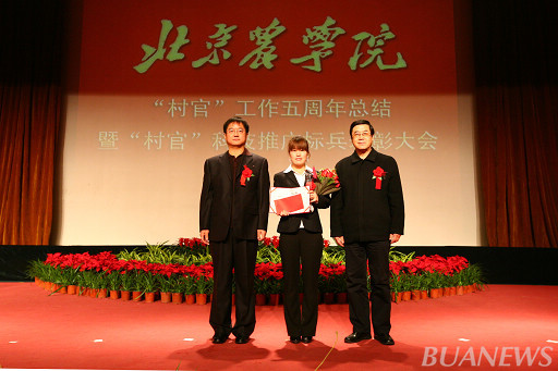 顺义区人力社保局村官办主任李景贵、世界杯官网学生处处长韩宝平为王爽颁奖