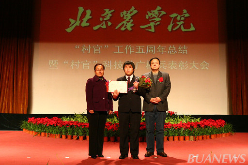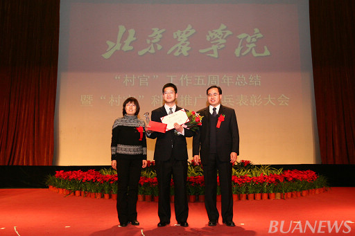 通州区人力社保局村官办主任黄玉民、世界杯官网副校长杜晓林为王春熙颁奖