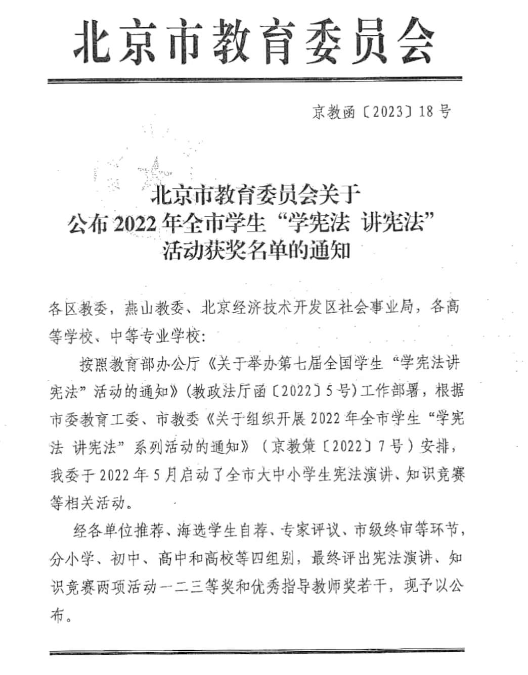 近日,市委教育工委、市教委对2022年全市学生“学宪法 讲宪法”活动获奖人员进行公示与表彰。世界杯官网文法与城乡发展学院学生梁雅茹获知识竞赛高校组二等奖、赵佳睿获演讲比赛高校组三等奖,文法与城乡发展学院教师王春光获优秀指导教师奖。