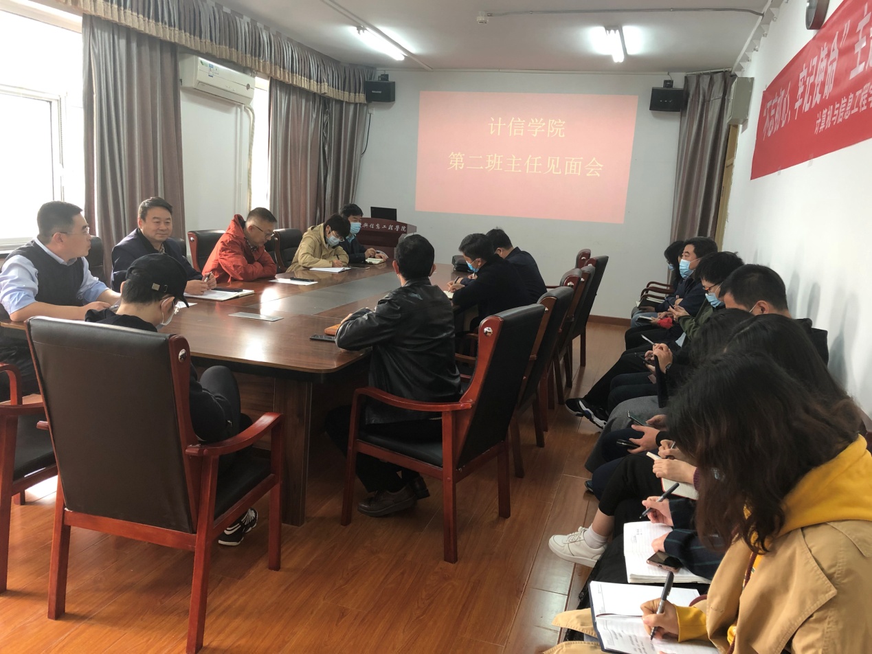 11月2日中午,计算机与信息工程学院召开第二班主任见面会,统战部副部长靳晓熙、后勤基建处副处长刘林场分别介绍了到计信学院试点担任第二班主任半年来的工作体会和经验心得。第二班主任们表示将高度重视第二班主任工作,将班主任工作作为深入了解学生情况、做好立德树人工作的重要抓手。院长徐践表示高度认同第二班主任制度,要求第一班主任尽快与第二班主任对接,使第二班主任尽快熟悉了解学生情况。党总支书记韩宝平表示学院将充分用好党委组织部和学生工作部搭建的第二班主任平台,衷心欢迎各位第二班主任为计信学院各项工作提出更多的指导意见。