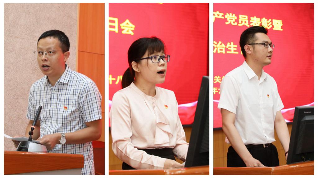 网络与信息中心建设与运维部主任刘爱东同志代表受表彰党员发言,做出要坚守初心使命,发扬孺子牛、拓荒牛、老黄牛精神,发挥党员先锋模范作用,为学校事业发展积极贡献力量的庄严承诺。教务处招生科科长吴卫元同志代表入党20周年党员发言,深情回忆入党20年来的心路历程和个人成长,表达对党组织20年培养的深切感恩。科技处党支部田野同志代表新党员发言,表示要坚定理想信念,践行宗旨意识,努力向优秀党员看齐,向老党员学习,以实际行动为党旗争光添彩。