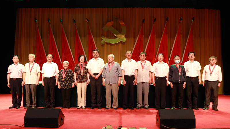 校领导班子成员为“光荣在党50年”的老党员代表颁发纪念章。